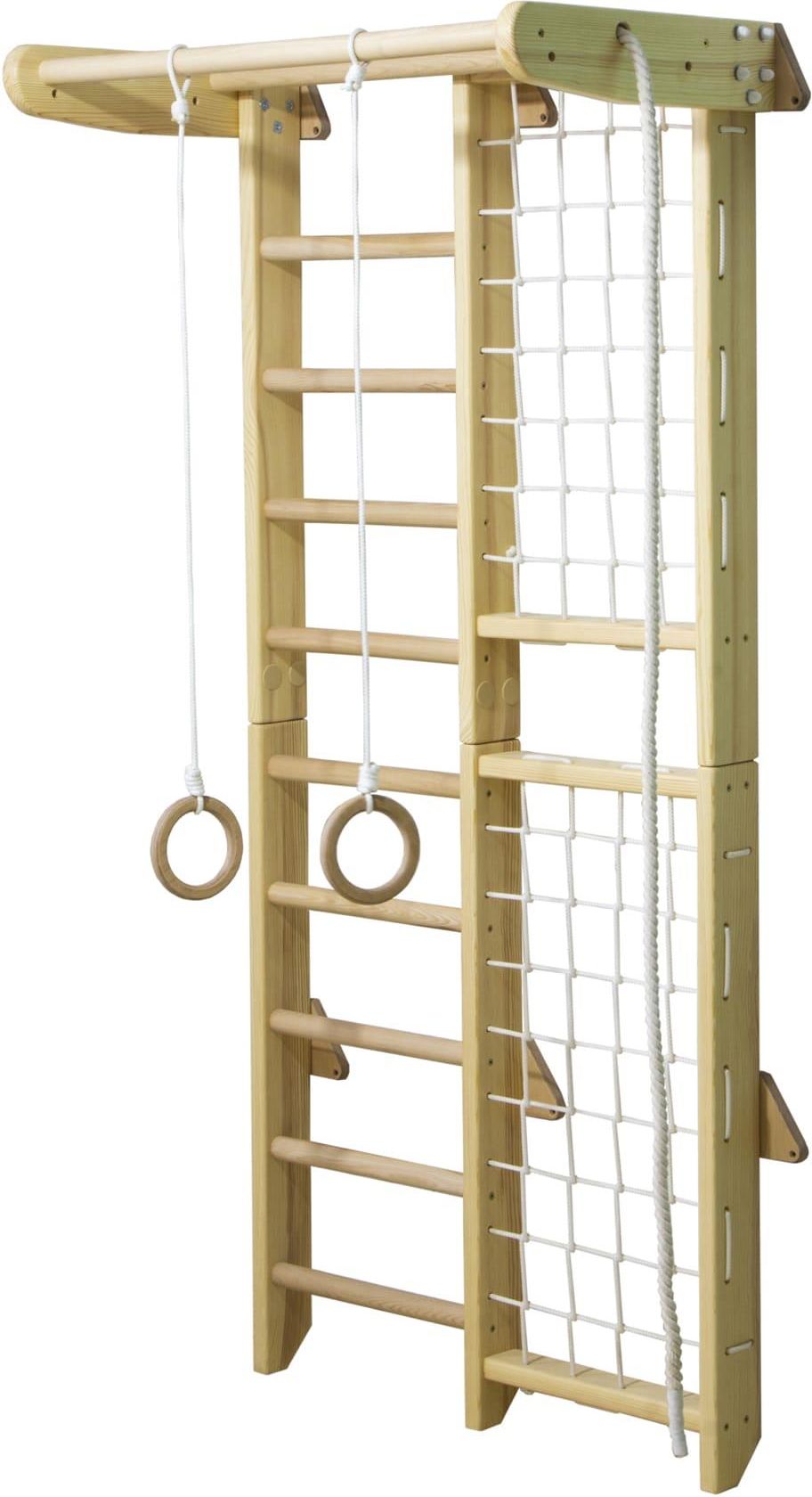 Drabinka gimnastyczna drewniana Kombik ELEMENTY ZESTAWU drewniana drabinka siatka wspinaczkowa drążek nieprzesuwny kółka gimnastyczne lina gimnastyczna WAZNE Dopuszczalne obciążenie: drabinki i drążka:100 kg akcesoriów zawieszanych: 50 kg Wysokość zestawu: 225 cm Szerokość drabinki z siatką: 100 cm Szerokość całkowita: 107 cm Głębokość drążka: 60 сm Montaż: przyścienny Kolorystyka: szary, biały