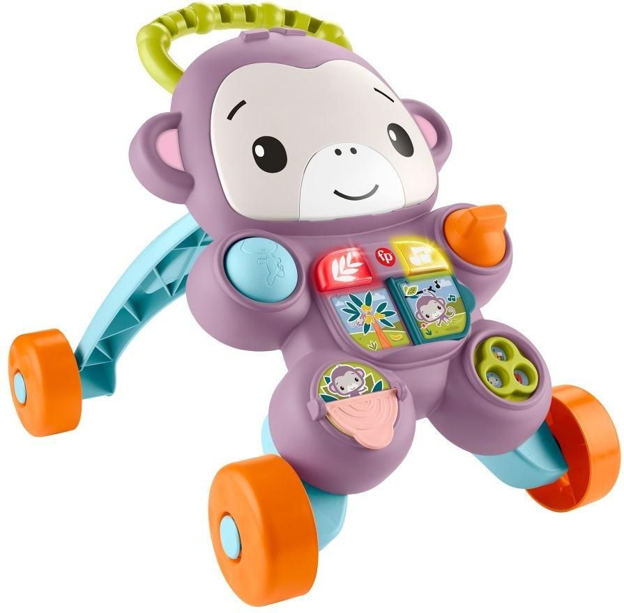 Z tym interaktywnym chodzikiem-pchaczem Fioletowa Małpka od Fisher-Price dziecko może stawiać swoje pierwsze kroki i świetnie się bawić! Ta muzyczna zabawka interaktywna chodzik-pchacz odtwarza angażującą melodię i posiada różnorodne elementy aktywizujące do odkrycia podczas zabawy na siedząco. Gdy szkrab jest gotów na pierwsze kroki i chodzenie, łatwy do trzymania uchwyt i stabilna podstawa z 4 kołami pomagają mu ćwiczyć tę umiejętność, nagradzając jego wysiłki muzyką i dźwiękami zachęcającym..