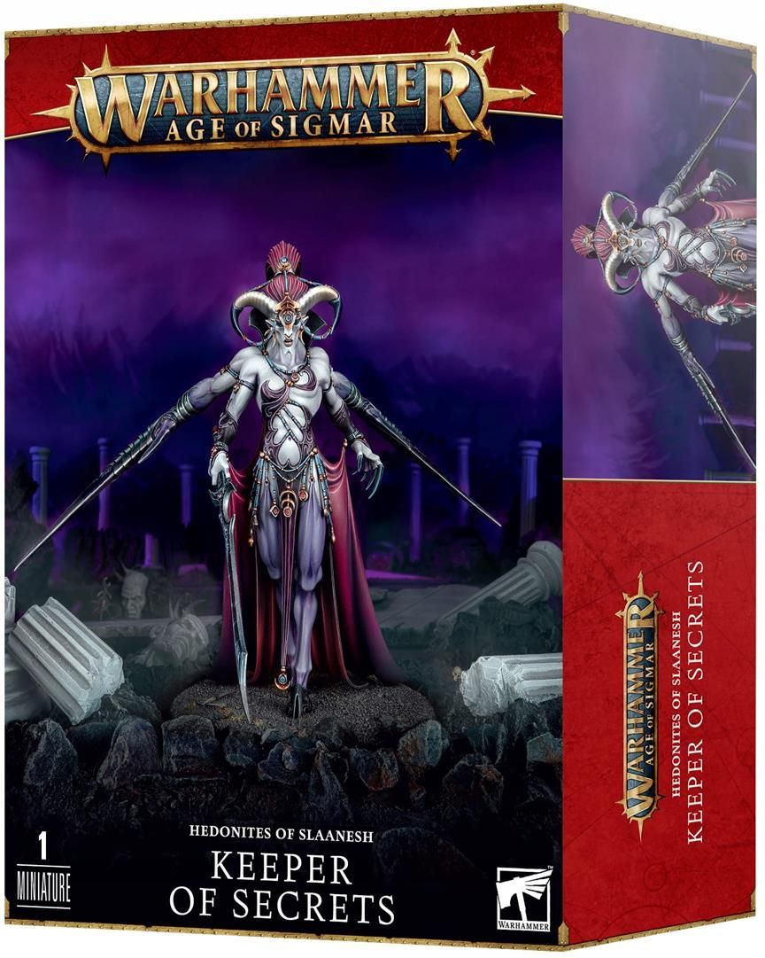 Produkt oryginalny. Do samodzielnego złożenia i pomalowania. Nie zawiera farb ani kleju. -------------------------------------------------------------------------------------- Opis producenta: A Keeper of Secrets is a Greater Daemon of Slaanesh, a consummate warrior and spellmaster of the Dark Prince’s hosts. Their four powerful limbs move languidly as they slink forwards – only to explode into lethal motion when their prey is in reach. The Keeper of Secrets is the most powerful and dangerous of Slaanesh’s servants – graceful, fast, and utterly deadly. On the battlefield, these towering combatants can scythe through infantry formations and heavy armour alike with a flurry of attacks. Each is also a sorcerer capable of unleashing foul magics that can allure their foes or utterly destroy them and an accomplished commander that’ll empower nearby Slaanesh units. You’ll even be able to use it in both Warhammer Age of Sigmar and Warhammer 40,000. This kit builds one Keeper of Secrets, and features a number of options for customisation, including a choice of head, weapons and impaling claws, allowing you to field multiples of this monster while ensuring they look distinct. What’s more, this kit can alternatively be used to build Daemon hero Shalaxi Helbane. This set is supplied in 51 plastic components, and comes with 1x 100mm round base. -------------------------------------------------------------------------------------- Więcej zdjęć i szczegółów dostępnych jest na stronie producenta