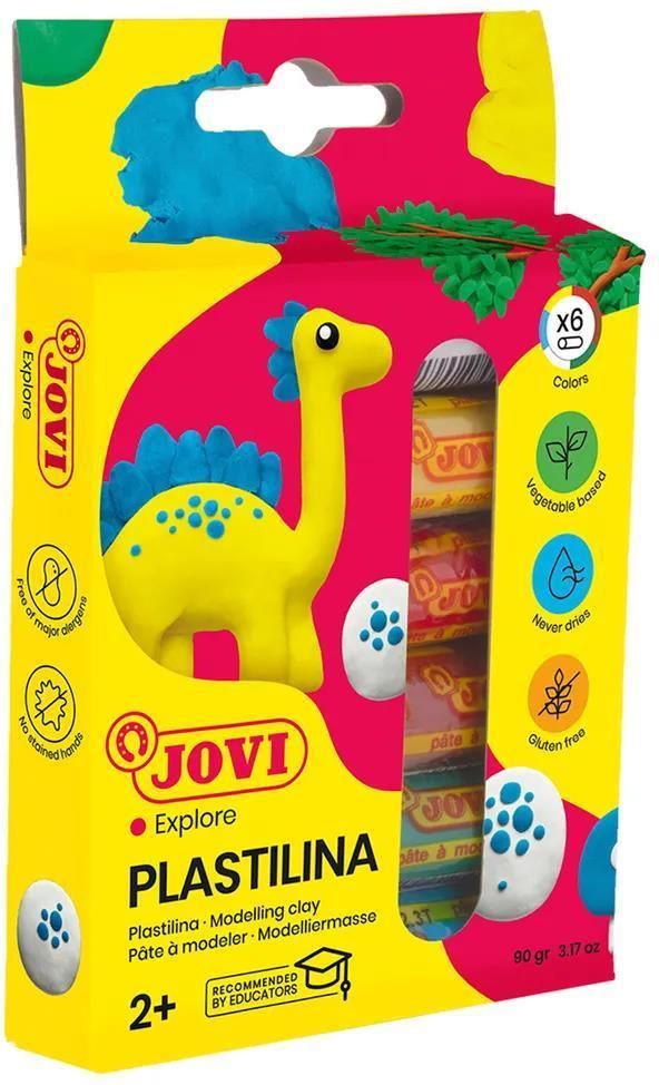 Opakowanie zawiera 6 lasek plasteliny JOVI po 15g, w różnych kolorach. Plastelina w kostkach firmy JOVI jest przyjemna w dotyku, plastyczna i nietoksyczna. Dostępna w energetycznych kolorach, które można ze sobą mieszać. Może być modelowana w niskich temperaturach. Ma dużą plastyczność jednak specjalnie dobrana konsystencja sprawia, że utworzone formy nie deformują się. Łatwo się modeluje. Produkt nie twardnieje, aby utrwalić efekt pracy oraz zabezpieczyć ją przed kurzem należy pomalować ją werniksem. Zabawy z plasteliną rozwijają wyobraźnię, kreatywne myślenie i sprawność manualną najmłodszych. Wyprodukowana na bazie napełniacza roślinnego, posiada do 33% więcej objętości od standardowej plasteliny. Mocna tekstura. Giętka i elastyczna: bardzo łatwo jest wyjąć ją z foremki, nie niszcząc kształtu. Można ją łatwo wygładzić palcami, nie pozostawiając śladów. Przeznaczona dla dzieci w wieku od 2 lat