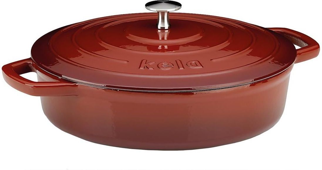 Kela - Brytfanna żeliwna+pokrywa3,2l czerwona Calido Brytfanna 3,2 l Calido Kela: - wykonana z żeliwa - dobrze rozprowadza ciepło, - emaliowana w środku i na zewnątrz, - dno o grubości 4-4,5 mm nadaje się na wszystkie kuchenki, - max. temperatura użytkowania w piekarniku - do 300° C, - waga ok. 5,4 kg, - należy myć ją ręcznie (po wystudzeniu). Bezpieczeństwo użytkowania: - uważać na ryzyko poparzenia gorącym naczyniem, - używać podkładek pod gorące naczynia i rękawic do przenoszenia, - nie zostawiać gorącego naczynia bez nadzoru oraz w zasięgu dzieci, - podczas smażenia na głębokim tłuszczu napełnić do ok. 1/3 wysokości ścianek, używać przykrywki. Wymiary: 7 x 28 cm (naczynie wys. x śr.) / 36 cm (dł. x uchwytami) / 13,5 cm (wys. z pokrywką) Materiał: żeliwo Kolor: czerwony, czarny Kolekcja: Calido