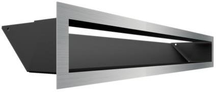 Kratka kominkowa luft 45S szlifowany 9x60 Kratka kominkowa produkcji polskiej firmy Kratki. pl stanowiąca estetyczne zakończenie kanałów rozprowadzających ciepłe powietrze z kominka do montażu w ścianie lub obudowie kominkowej. Kratka wyróżnia się nowoczesnym i minimalistycznym wyglądem, a jej podłużna forma sprawia, że doskonale sprawdza się we wnętrzach utrzymanych w stylu współczesnym. Charakterystycznymi cechami modelu LUFT 45S są: zamaskowany wlot powietrza – wykonany pod kątem 45 stopni oraz front bez widocznych łączeń. Produkt malowany metodą proszkową, dzięki czemu kolor pozostaje trwały i odporny na działanie podwyższonej temperatury, a kratka jest bardziej odporna na uszkodzenia mechaniczne. Prawidłowy montaż Jeżeli kratkę instalujemy nad kominkiem - wlot powietrza powinien znajdować się na spodzie, jeżeli pod wkładem - wlot powinien być na górze. Pozwoli to zachować odpowiedni, konwekcyjny przepływ ogrzewanego powietrza Pole czynne kratki 342cm2