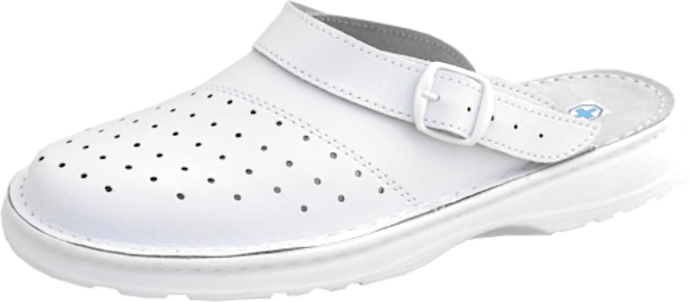 Klapki medyczne męskie białe Wysokiej jakości komfortowe obuwie wykonane ze skóry naturalnej pokrytej membraną. Profilowane ortopedycznie z antypoślizgowymi podeszwami dedykowane Panom pracującym na oddziałach szpitalnych w przychodniach domach opieki i innych placówkach medycznych. Opis techniczny wierzch - cholewka skórzana wykonana ze skór naturalnych wykończona powłokami odpornymi na zmywanie ,cholewka zamknięta z otworami wentylacyjnymi, pasek dwufunkcyjny z możliwością założenia na piętę lub ułożenia na cholewce wyściółka - skóra naturalna spód - o urzeźbieniu przeciwpoślizgowym z poliuretanu (PU) wewnętrzny profil ortopedyczny , sposób montażu - wierzch łączony ze spodem szyciem ręcznym Obuwie atestowane: PN-EN ISO 20 347 : 2012 Dostępne rozmiary od 39 do 47 Długość wkładki
