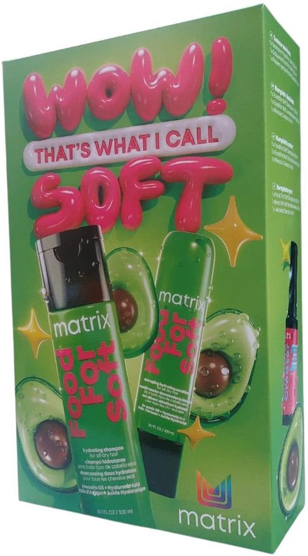 Zestaw idealny na prezent w pięknych pudełkach ozdobnych. Szampon FOOD FOR SOFT intensywnie nawilża i oczyszcza włosy z zabrudzeń oraz sebum nie usuwając przy tym potrzebnego im nawilżenia. Profesjonalna pielęgnacja Formuła wzbogacona olejem z awokado, który pomaga zamknąć łuskę włosa, przeciwdziałając utracie wilgoci. Do pielęgnacji wszystkich rodzajów suchych włosów Sposób użycia: Produkt odpowiedni do codziennego użytku. Nałóż pożądaną ilość produktu na skórę głowy, a następnie rozprowadź na długości i końce włosów. Spień. Spłucz. Kolejno zastosuj odżywkę oraz olejek do włosów FOOD FOR SOFT. W przypadku dostania się preparatu do oczu natychmiast przepłucz je wodą. Dla kogo dedykowana jest gama Food For Soft? Gama FOOD FOR SOFT dedykowana jest dla konsumentek z suchymi włosami, które szukają intensywnego nawilżenia oraz pragną, aby ich włosy stały się odczuwalnie miękkie. Świetnie sprawdzi się także do pielęgnacji włosów wysokoporowatych i po zabiegach koloryzacji. Kluczowe składniki: - Olej z awokado - Bogaty w niezbędne nienasycone kwasy tłuszczowe. Pomaga zamknąć łuskę włosa przeciwdziałając utracie wilgoci. Wspiera lipidy naturalnie obecne we włosie. Lekka formuła dla szerokiego zastosowania. Odpowiada za odżywienie, miękkość i gładkość włosów - Kwas hialuronowy - Ma zdolność do pochłaniania 1000x więcej wody niż własna waga. Posiada właściwości higroskopijne. Wspiera odpowiednie nawilżenie wszystkich rodzajów włosów Zapewnia miękkość i wygładzenie FOOD FOR SOFT to profesjonalna, intensywnie nawilżająca gama od Matrix do pielęgnacji wszystkich rodzajów suchych włosów. Zawiera ona olej z awokado i kwas hialuronowy. Przy zastosowaniu systemu składającego się z szamponu, odżywki lub maski i olejku* włosy zyskują 7x więcej nawilżenia oraz stają się odczuwalnie miękkie nawet do 72 godzin.** Dodatkowo olejek do włosów FOOD FOR SOFT chroni włosy przed negatywnym działaniem urządzeń termicznych do stylizacji (nawet do 230°C).** *W porównaniu do samego szamponu. **Test instrumentalny. Maska FOOD FOR SOFT pomaga przywrócić odpowiedni poziom nawilżenia nawet najbardziej przesuszonym i wysokoporowatym włosom. CZYM CHARAKTERYZUJĄ SIĘ FORMUŁY GAMY FOOD FOR SOFT? Formuły gamy FOOD FOR SOFT, składającej się z szamponu, odżywki lub maski i olejku do włosów, wzbogacone są olejem z awokado, który pomaga zamknąć łuskę włosa przeciwdziałając utracie wilgoci. Dodatkowo formuły szamponu, odżywki i maski FOOD FOR SOFT wzbogacone są kwasem hialuronowym, który wspiera odpowiednie nawilżenie wszystkich rodzajów włosów. DLA KOGO DEDYKOWANA JEST GAMA FOOD FOR SOFT? Gama FOOD FOR SOFT dedykowana jest dla konsumentek z suchymi włosami, które szukają intensywnego nawilżenia oraz pragną, aby ich włosy stały się odczuwalnie miękkie. Świetnie sprawdzi się także do pielęgnacji włosów wysokoporowatych i po zabiegach koloryzacji. Pełna lista składników: 1218318MX2 - INGREDIENTS: AQUA / WATER • SODIUM LAURETH SULFATE • SODIUM LAURYL SULFATE • COCAMIDOPROPYL BETAINE • SODIUM CHLORIDE • GLYCOL DISTEARATE • HEXYLENE GLYCOL • PARFUM / FRAGRANCE • COCAMIDE MEA • CITRIC ACID • SODIUM BENZOATE • SODIUM HYDROXIDE • DIMETHICONE • CARBOMER • COCO-BETAINE • SALICYLIC ACID • GUAR HYDROXYPROPYLTRIMONIUM CHLORIDE • MENTHOL • AMODIMETHICONE • GLYCERIN • PERSEA GRATISSIMA OIL / AVOCADO OIL • LINALOOL • TRIDECETH-10 • BENZYL SALICYLATE • BENZYL ALCOHOL • COUMARIN • PEG-100 STEARATE • STEARETH-6 • SODIUM HYALURONATE • LIMONENE • TRIDECETH-3 • PHENOXYETHANOL • FUMARIC ACID • ACETIC ACID • TOCOPHEROL • HELIANTHUS ANNUUS SEED OIL / SUNFLOWER SEED OIL • ROSMARINUS OFFICINALIS LEAF EXTRACT / ROSEMARY LEAF EXTRACT (F.I.L. Z70014596/1). Pojemność: 300 ml Odżywka FOOD FOR SOFT pomaga przywrócić odpowiedni poziom nawilżenia włosom przesuszonym i łamliwym, a także pomaga w ich rozplątywaniu. Profesjonalna pielęgnacja Formuła wzbogacona olejem z awokado, który pomaga zamknąć łuskę włosa, przeciwdziałając utracie wilgoci. Do pielęgnacji wszystkich rodzajów suchych włosów FOOD FOR SOFT to profesjonalna, intensywnie nawilżająca gama od Matrix do pielęgnacji wszystkich rodzajów suchych włosów. Zawiera ona olej z awokado i kwas hialuronowy. Przy zastosowaniu systemu składającego się z szamponu, odżywki lub maski i olejku* włosy zyskują 7x więcej nawilżenia oraz stają się odczuwalnie miękkie nawet do 72 godzin.** Dodatkowo olejek do włosów FOOD FOR SOFT chroni włosy przed negatywnym działaniem urządzeń termicznych do stylizacji (nawet do 230°C).** *W porównaniu do samego szamponu. **Test instrumentalny. Odżywka FOOD FOR SOFT pomaga przywrócić odpowiedni poziom nawilżenia włosom przesuszonym i łamliwym, a także pomaga w ich rozplątywaniu. CZYM CHARAKTERYZUJĄ SIĘ FORMUŁY GAMY FOOD FOR SOFT? Formuły gamy FOOD FOR SOFT, składającej się z szamponu, odżywki lub maski i olejku do włosów, wzbogacone są olejem z awokado, który pomaga zamknąć łuskę włosa przeciwdziałając utracie wilgoci. Dodatkowo formuły szamponu, odżywki i maski FOOD FOR SOFT wzbogacone są kwasem hialuronowym, który wspiera odpowiednie nawilżenie wszystkich rodzajów włosów. DLA KOGO DEDYKOWANA JEST GAMA FOOD FOR SOFT? Gama FOOD FOR SOFT dedykowana jest dla konsumentek z suchymi włosami, które szukają intensywnego nawilżenia oraz pragną, aby ich włosy stały się odczuwalnie miękkie. Świetnie sprawdzi się także do pielęgnacji włosów wysokoporowatych i po zabiegach koloryzacji. Sposób użycia: Produkt odpowiedni do codziennego użytku. Po zastosowaniu szamponu FOOD FOR SOFT nałóż na mokre włosy, zaczynając od połowy ich długości, aż po końce. Pozostaw na minutę. Spłucz. Nałóż olejek. W przypadku dostania się preparatu do oczu natychmiast pr
