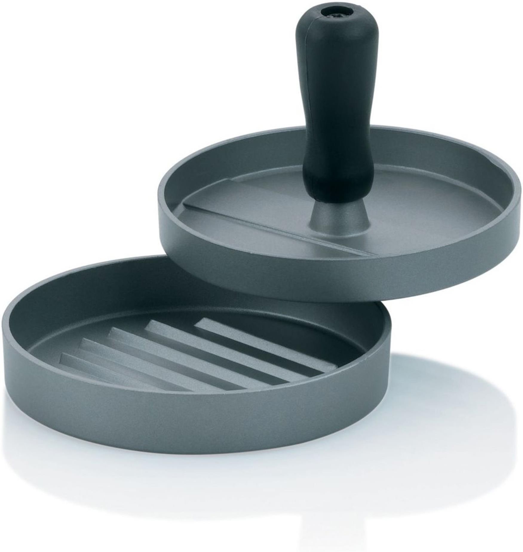Metalowa forma - prasa do hamburgerówNowoczesna i elegancka aluminiowa prasa do robienia hamburgerów. Idealnie nadaje się do uzyskania odpowiedniej formy kotleta, który będzie w każdym miejscu tej samej grubości dzięki czemu będzie równomiernie upieczony. Nieprzywierająca powierzchnia z charakterystycznymi nacięciami spowoduje, że mięso po upieczeniu stanie się pyszne i chrupiące. Prasa do hamburgerów to niezbędny przyrząd w każdej kuchni. Przeznaczony do tworzenia idealnych porcji mięsnych pod względem kształtu, wielkości oraz wagi. Zaprojektowana do wszystkich rodzajów mięsa mielonego, a także kombinacji mięsnych z innymi składnikami. Mieszankę mięsa z warzywami można w bardzo łatwy sposób przygotować do smażenia w formie jednolitych kotletów. Niezbędna przy tworzeniu hamburgerów wołowych, z indyka, z kawałków kiełbasy, wegańskich, wegetariańskich oraz wielu, wielu innych odmian. Specyfikacja: - Materiał: Odlew aluminium - Kolor: Szary, powłoka antyadhezyjna - Wysokość formy: 2 cm - Średnica: 11,5 cm - Wysokość całkowita: 9 cm
