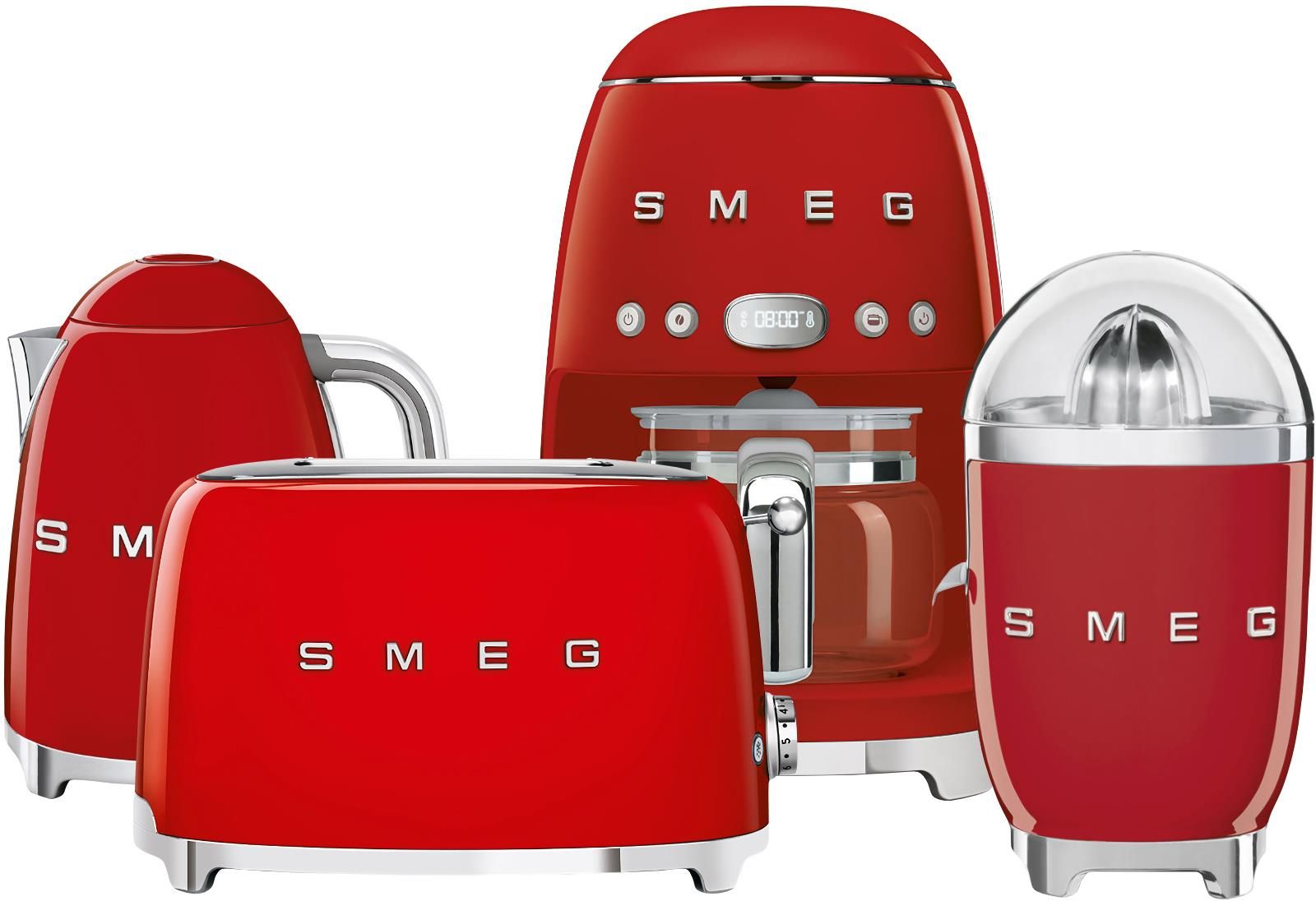 Zestaw produktów 50's Retro Style w czerwonym kolorze. W zestawie ekspres do kawy dcf02, czajnik klf03, toster tsf01 i wyciskarka cjf01. Do przygotowywania kawy i śniadań.
