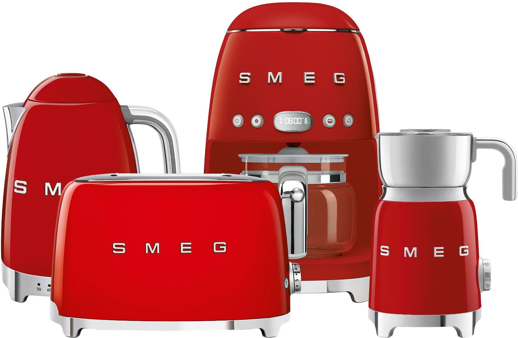 Zestaw produktów 50's Retro Style w czerwonym kolorze. W zestawie ekspres do kawy dcf02, czajnik klf04, toster tsf01 i spieniacz do mleka mff01. Do przygotowywania kawy i śniadań.