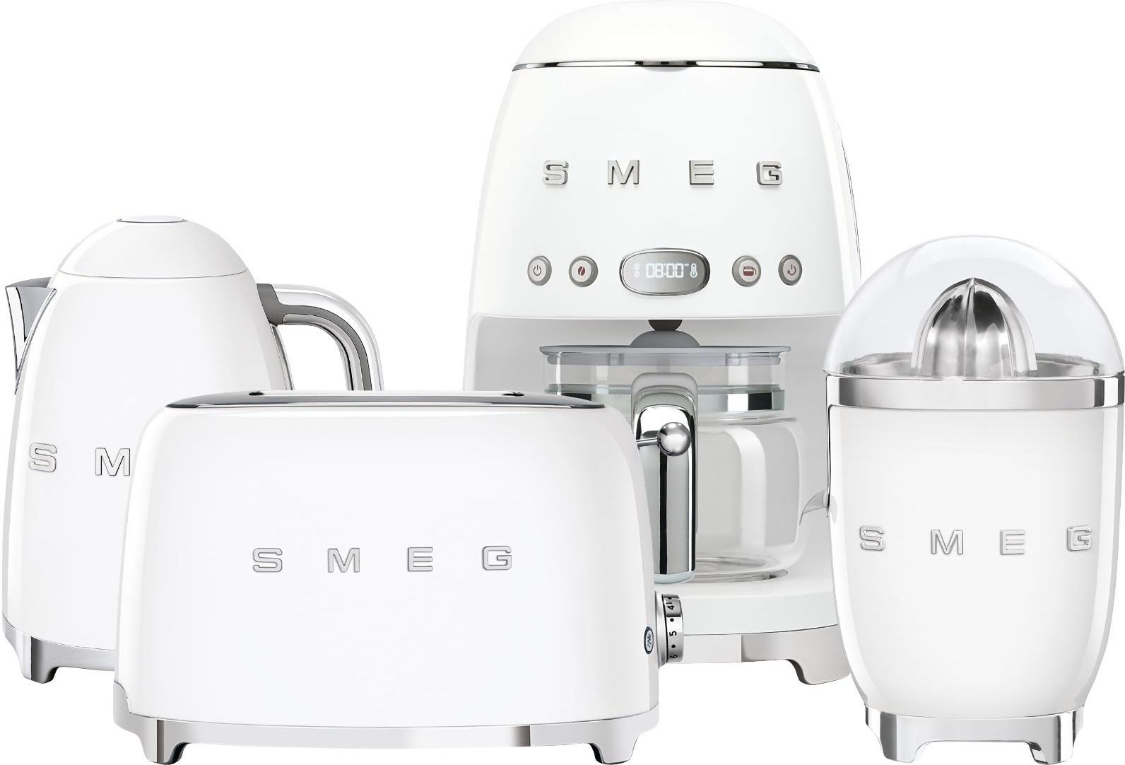 Zestaw produktów 50's Retro Style w białym kolorze. W zestawie ekspres do kawy dcf02, czajnik klf03, toster tsf01 i wyciskarka cjf01. Do przygotowywania kawy i śniadań.