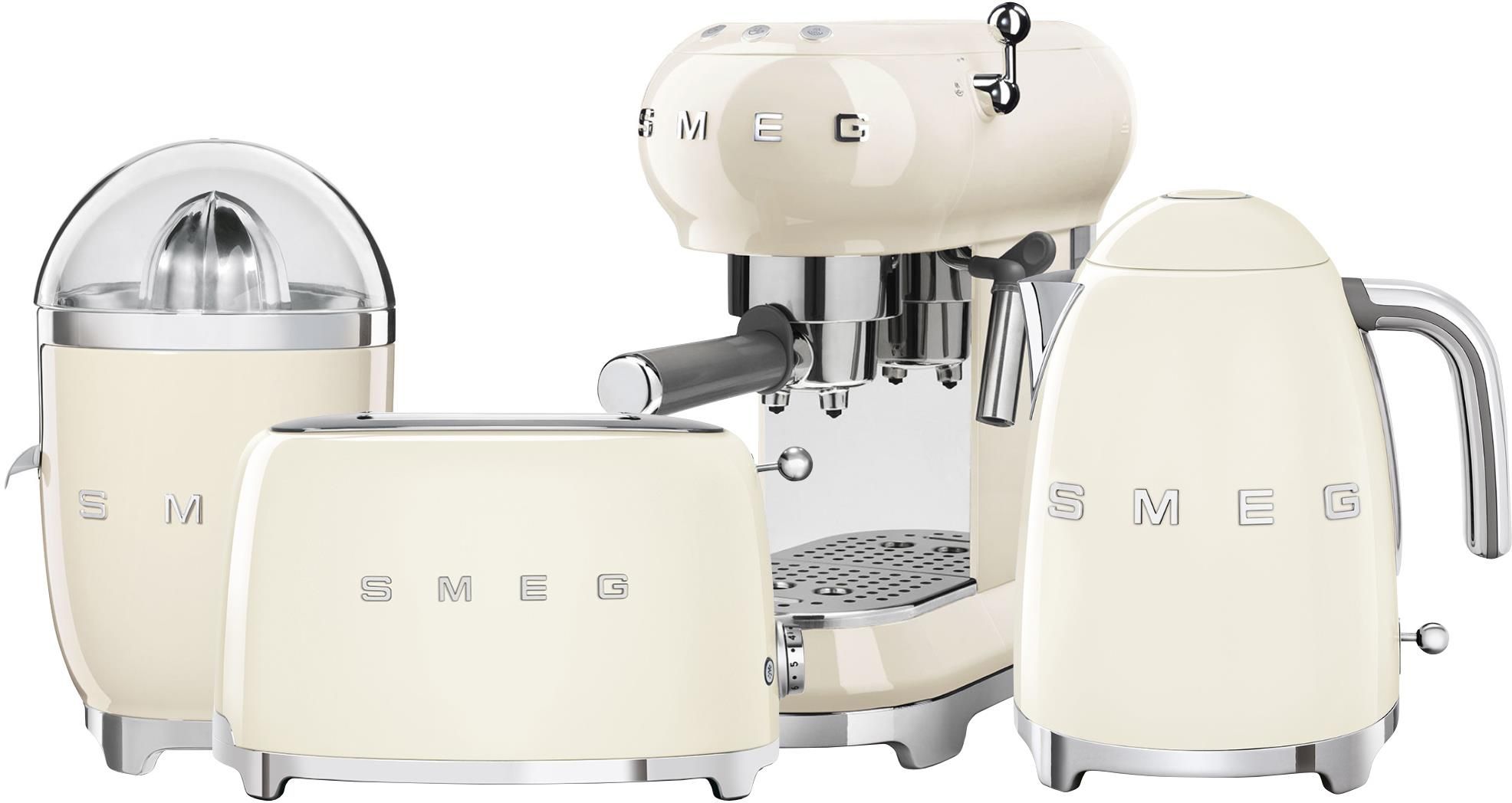 Zestaw z ekspresem i wyciskarką 50's Retro Style w kolorze kremowym. W zestawie znajdują się też czajnik KLF03 i toster na 2 kromki. Idealny do porannych posiłków.