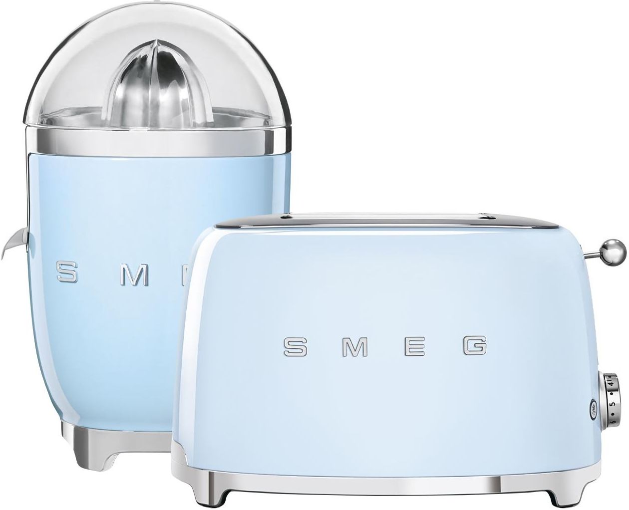 Zestaw śniadaniowy 50's Retro Style Prezentowany zestaw śniadaniowy produktów z linii 50’s Retro Style marki Smeg to doskonały duet ułatwiający przygotowanie porannego posiłku z dodatkiem świeżo wyciskanego soku. Wykonane z wysokiej jakości materiałów - m.in. tworzywa i stali nierdzewnej - urządzenia dzięki opływowym kształtom, chromowanym podstawom oraz pastelowemu błękitnemu kolorowi elegancko zaprezentują się na blacie kuchennym, uzupełniając współczesne wystroje - można je więc będzie przechowywać na widoku, gdy akurat nie będą używane. Toster na dwie kromki posiada komory o szerokości 36 mm. Pieczywo automatycznie umieszczane jest na ich dnie oraz automatycznie wysuwane po zakończeniu cyklu opiekania, co przyspiesza przygotowywanie tostów. Sześciostopniowa regulacja umożliwia łatwą kontrolę poziom opiekania. Natomiast trzy programy pracy pozwalają na podgrzewanie kromek, rozmrażanie pieczywa oraz przygotowywanie bajgli, co tylko zwiększa zastosowania tostera. Zainstalowana wewnątrz, łatwa w opróżnianiu tacka zbiera okruchy, zapobiegając powstawaniu niepotrzebnego bałaganu wokół urządzenia. Funkcje tostera: 6 stopni opiekania 3 programy: podgrzewanie, rozmrażanie, bajgiel Elektryczna wyciskarka do cytrusów pozwoli na łatwe uzyskanie świeżego soku z cytryn, pomarańczy czy grejpfrutów. Posiada ona silnik ze zintegrowanym czujnikiem włączania / wyłączania. Wyposażona została w dzióbek z zabezpieczeniem przed kapaniem, który ogranicza zabrudzenia na jej powierzchni pozwalając na wygodne przelewanie soku do dzbanków czy szklanek. Stożek wyciskający wykonano ze stali nierdzewnej, tak samo filtr, dzięki czemu urządzenie jest trwałe i odporne na korozję. Antypoślizgowe nóżki zapewniają większą stabilność podczas pracy z wyciskarką, a schowek na przewód zasilający ułatwia jego przechowywanie. Dodatkowo urządzenie posiada pokrywkę z przezroczystego Tritanu bez BPA, która chroni je przed kurzem, ułatwiając czyszczenie. Charakterystyka wyciskarki: Stożek wyciskający ze stali nierdzewnej Filtr ze stali nierdzewnej  Pokrywka z TritanTM wolna od BPA Dzióbek z zabezpieczeniem przed kapaniem ze stali nierdzewnej  Pojemnik na sok z TritanTM wolny od BPA Schowek na przewód zasilający Nóżki antypoślizgowe