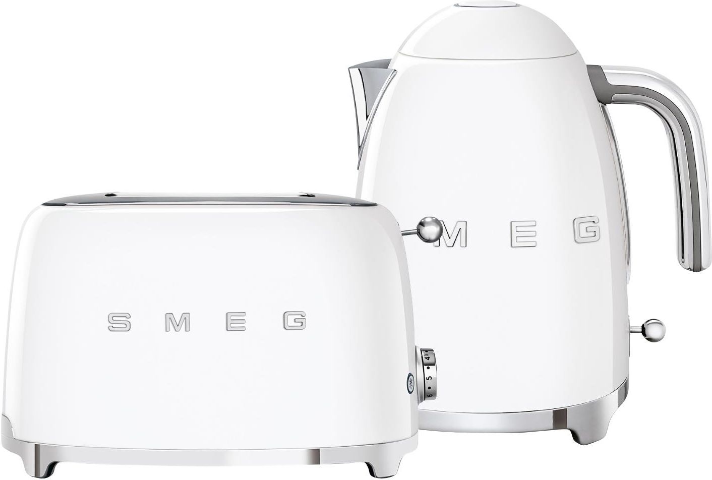 Zestaw śniadaniowy 50's Retro Style Oferowany zestaw śniadaniowy produktów z linii 50’s Retro Style marki Smeg to doskonały duet ułatwiający przygotowanie porannego posiłku. Wykonane z wysokiej jakości materiałów - m.in. tworzywa i stali nierdzewnej - urządzenia dzięki opływowym kształtom, chromowanym podstawom oraz neutralnemu białemu kolorowi wspaniale zaprezentują się na blacie kuchennym, uzupełniając nowoczesne wystroje - można je będzie przechowywać na widoku, gdy akurat nie będą używane. Toster na dwie kromki posiada komory o szerokości 36 mm. Pieczywo automatycznie umieszczane jest na ich dnie oraz automatycznie wysuwane po zakończeniu cyklu opiekania, co przyspiesza przygotowywanie tostów. Sześciostopniowa regulacja daje możliwość kontroli poziomu opiekania. Natomiast trzy programy pracy pozwalają na podgrzewanie kromek, rozmrażanie pieczywa oraz przygotowywanie bajgli, co zwiększa zastosowania tostera. Zainstalowana wewnątrz, łatwa w opróżnianiu tacka zbiera okruchy, zapobiegając powstawaniu niepotrzebnego bałaganu wokół urządzenia. Funkcje tostera: 6 stopni opiekania 3 programy: podgrzewanie, rozmrażanie, bajgiel Czajnik o pojemności 1,7 L z pokrywką otwieraną przy użyciu systemu Soft Opening posiada w swoim wnętrzu bezpieczny i praktyczny system grzewczy z ukrytymi elementami grzewczymi. Wygodna podziałka z przeliczeniem na litry oraz filiżanki pozwala łatwo kontrolować poziom wody. Urządzenie wyposażone zostało w wyjmowany filtr wapienny ze stali nierdzewnej, który ogranicza osadzanie się kamienia w jego wnętrzu. Dodatkowe bezpieczeństwo użytkowania zapewniają automatyczne wyłączanie się po zagotowaniu wody oraz brak możliwości uruchomienia przy pustym zbiorniku. Zaletą produktu jest również podstawa pozwalająca na obracanie w zakresie 360 stopni. Zalety czajnika: Otwieranie pokrywki z systemem Soft Opening  Podwójny sposób wizualizacji poziomu wody (l / filiżanki) Wyjmowany filtr wapienny ze stali nierdzewnej Automatyczne wyłączenie przy 100°C Automatyczne wyłączenie przy pustym czajniku Obracanie czajnika na podstawie 360°