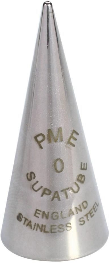 Tylka cukiernicza okrągła - PME - nr 0 Tylka cukiernicza numer 0 marki PME z okrągłym otworem. Dedykowana do wyciskania zdobień z dowolnej masy w kształcie małych linii, obwódek, kropek, piłek, koralików, stun i koronek. Wykonana została ze stali nierdzewnej. Zaleca się mycie ręczne. WYMIARY: średnica podstawy – 1,7 cm; średnica otworu – ok. 0,1 cm; wysokość - 4 cm MATERIAŁ: stal nierdzewna