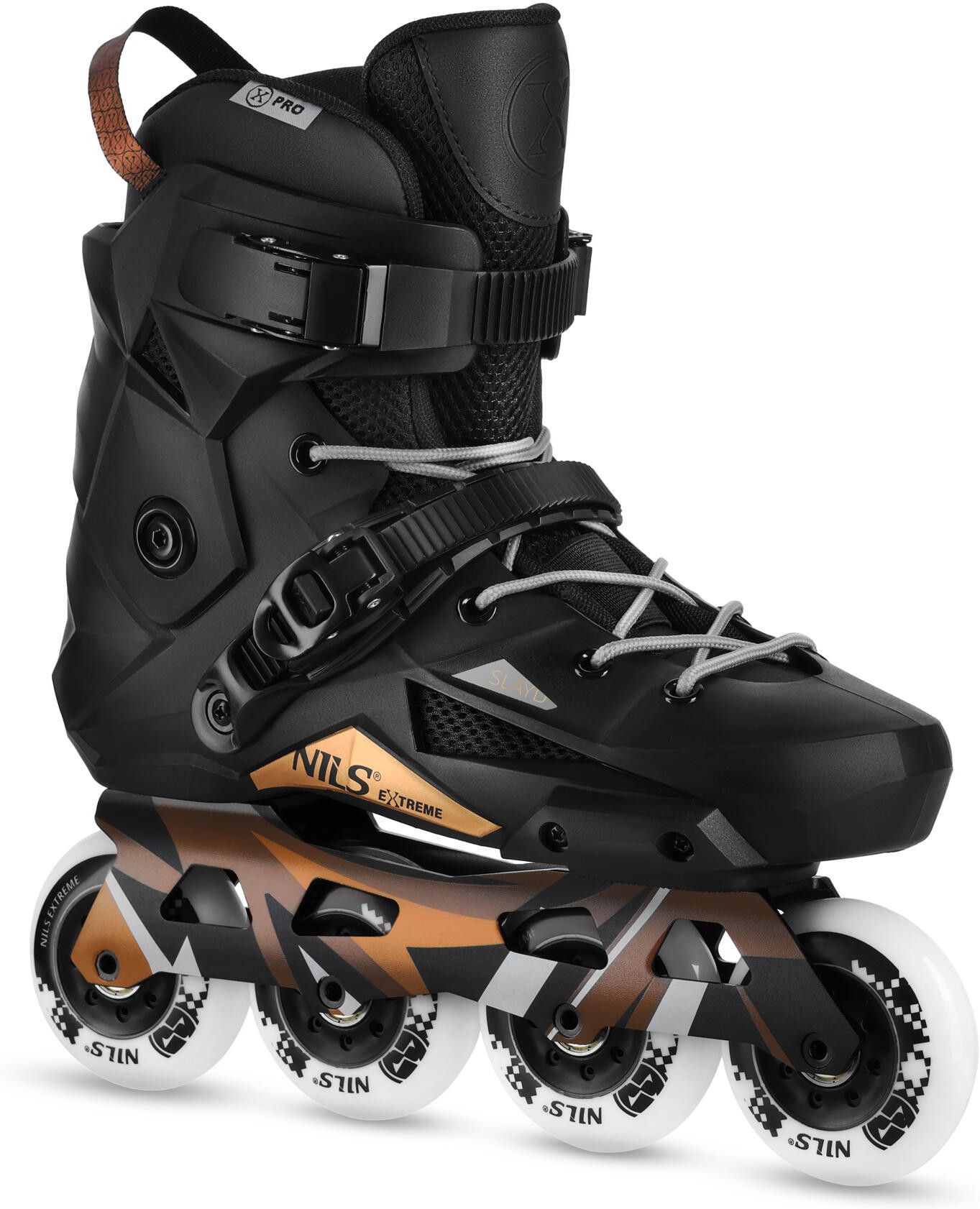 NA1601 ŁYŻWOROLKI SLALOMOWE CZARNE NILS EXTREME to model zaprojektowany do jazdy technicznej i dynamicznej, w której liczy się precyzja oraz szybka reakcja na ruch stopy. Rolki najlepiej sprawdzają się w slalomie, czyli podczas płynnych skrętów, częstych zmian kierunku i pracy na krawędziach. Będą dobrym wyborem także do sportowej jazdy po mieście, gdy chcesz jechać pewnie, stabilnie i z pełną kontrolą nad torem jazdy. W tym modelu kluczowe znaczenie ma skorupa wykonana z HIGH IMPACT PP. Zastosowanie tego materiału sprawia, że skorupa skutecznie pracuje pod obciążeniem i amortyzuje wstrząsy, co realnie przekłada się na dłuższą żywotność rolek. Jednocześnie pomaga utrzymać stabilne wsparcie stopy i kostki, dzięki czemu podczas jazdy slalomem łatwiej zachować kontrolę, pewniej trzymać pozycję i płynniej przenosić energię w skrętach. Za precyzję odpowiada aluminiowa szyna , frezowana z jednego kawałka. Taki sposób wykonania daje większą sztywność i dokładność niż w przypadku szyn odlewanych, dzięki czemu rolki szybciej reagują na pracę stopy i prowadzą stabilniej przy dynamicznych skrętach. Szyna dłużej utrzymuje poprawną geometrię pod obciążeniem, co ma znaczenie, gdy jeździsz intensywnie i zależy Ci na powtarzalnym, pewnym zachowaniu sprzętu. Wysoką płynność toczenia zapewniają łożyska ABEC-9 Carbon, czyli szybkie i precyzyjne łożyska o wysokiej klasie wykonania. Ułatwiają utrzymanie prędkości i dają bardziej swobodne rozpędzanie, a określenie „Carbon” zwykle oznacza lżejszy koszyczek lub separator o niższym tarciu. To rozwiązanie wspiera dynamiczne przyspieszenia i płynne zmiany tempa, które są szczególnie ważne w jeździe slalomowej. Całość uzupełniają kółka PU 85A w rozmiarze 80 × 24 mm, które łączą dobrą przyczepność z trwałością i stabilnym prowadzeniem. Za pewne dopasowanie odpowiada zestaw zapięć w postaci metalowych klamer oraz sznurowadeł. Taki układ pozwala mocno trzymać stopę, co zwiększa kontrolę w skrętach, ułatwia przenoszenie energii na rolki i daje większą pewność podczas szybkiej, technicznej jazdy. NA1601 to propozycja dla osób, które chcą rozwijać technikę, jeździć dynamicznie i oczekują sprzętu nastawionego na precyzję oraz wytrzymałość. Specyfikacja Rozmiar: 45 Długość wkładki: 29,5 cm Skorupa: HIGH IMPACT PP Szyna: aluminiowa Łożyska: ABEC-9 Carbon Kółka: PU 85A Wymiary kółek: 80 × 24 mm Zapięcie: metalowe klamry + sznurowadła Maksymalne obciążenie: do 100 kg Norma: EN 13843:2009