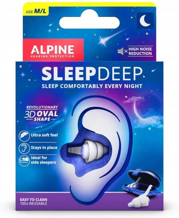 Alpine Sleep Deep zatyczki do spania Najważniejsze cechy: • wysoki komfort użytkowania • owalny kształt dopasowuje się do naturalnego kształtu przewodu słuchowego • wykonane z wysokiej jakości, miękkiego i łatwego do czyszczenia materiału termoplastycznego AlpineThermoShape, który jest hipoalergiczny • w opakowaniu znajdują się dwie zatyczki do uszu SleepDeep wraz z podróżnym etui Wysoki komfort użytkowania Zatyczki do uszu SleepDeep to bardzo wygodne stopery zapewniające głęboki i spokojny sen. Specjalnie zaprojektowany owalny kształt dopasowuje się do naturalnego kształtu przewodu słuchowego, dzięki czemu zatyczki pozostają na swoim miejscu przez całą noc. Idealnie sprawdzą się u osób, które lubią spać na boku. Zatyczki zostały wykonane z wysokiej jakości, miękkiego i łatwego do czyszczenia materiału termoplastycznego AlpineThermoShape, który jest hipoalergiczny. Poprzez brak silikonów nie powoduje uciążliwego swędzenia ani innych niepożądanych reakcji alergicznych. Specjalny żel redukujący szumy SleepDeep ALPINE zawierają specjalny żel redukujący szumy, co skutkuje maksymalnym tłumieniem oraz ułatwia zasypianie jak i zapobiega łatwemu wybudzaniu. Średnie tłumienie (SNR) zatyczek wynosi 27 dB. Żywotność zatyczek ALPINE zależy od częstotliwości ich użytkowania oraz pielęgnacji.  Stopery ulegają naturalnemu zużyciu. Producent gwarantuje niezmienność parametrów podczas stu pierwszych aplikacji. Utrzymywanie zatyczek do uszu w czystości wydłuży ich żywotność. Zalecamy stosowanie płynu ALPINE Clean Spray lub można je czyścić pod letnią wodą z mydłem. Następnie należy je odstawić do całkowitego wyschnięcia.