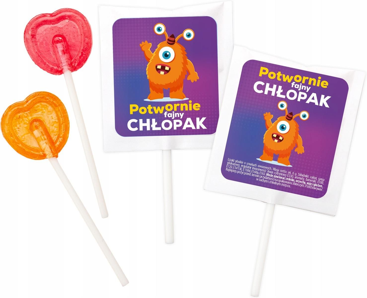 Słodki upominek na Dzień Chłopaka Urocze, małe lizaki owocowe w kształcie serca, zapakowane w papierowe saszetki z nadrukiem na Dzień Chłopaka. To idealna, niedroga niespodzianka dla dzieci i dorosłych – w sam raz na szkolne zabawy, imprezy tematyczne czy słodki poczęstunek dla gości. Mix smaków truskawkowy jabłkowy pomarańczowy cytrynowy Opakowanie Papierowe saszetki z nadrukiem (wzór jak na zdjęciu, brak personalizacji). Parametry produktu waga netto jednego lizaka: ok. 5 g wymiary saszetki: ok. 53 × 58 mm termin przydatności: 6 miesięcy zestaw: 50 lizaków Dlaczego warto? atrakcyjna forma – kolorowe serduszka w klimatycznym opakowaniu uniwersalny upominek na Dzień Chłopaka praktyczne, gotowe do rozdania saszetki Składniki cukier, syrop glukozowy, regulator kwasowości: kwas cytrynowy E330, aromaty, barwniki: E100, E120, E141(ii), E150d, E160a, E163. Może zawierać: mleko, orzechy, soję i gluten.