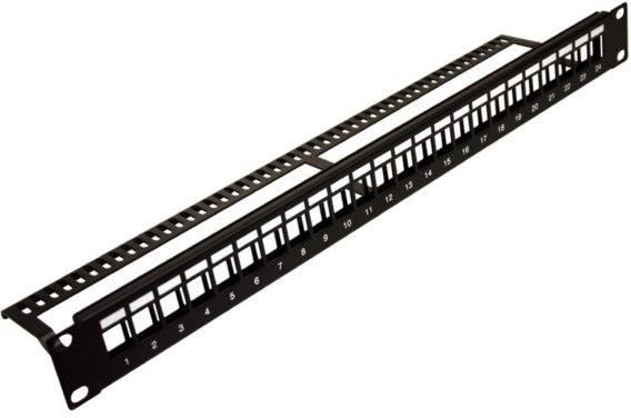 24 PORTOWY PATCH PANEL 19" 1U – PUSTY Z ORGANIZEREM 24 otwory montażowe do gniazd uniwersalnych posiada uchwyty do mocowania przewodów szerokość – 19" wysokość – 1U Oferowany Patch Panel przeznaczony jest do montażu w szafie rack o wymiarze 19" - 1U. Jest panelem montażowym tzw. pustym. Daje to możliwość obsadzenia różnymi modułami uniwersalnymi, a co za tym idzie dowolnej konfiguracji. Posiada 24 otwory do umiejscowienia modułów. Każde ze złącz posiada numer (od 1 - 24) oraz możliwość oznaczenia - opisu. W tylnej części umieszczono organizer kabli umożliwiający zamocowanie przewodów.