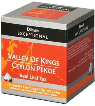 Dilmah Valley of Kings Ceylon Pekoe 3 sztuki Klasyczna czarna herbata cejlońska. 20 stożkowych biodegradowalnych torebek ekspresowych 2g z zawieszką. Czarna herbata - lekka, jasna, o delikatnym, wykwintnym, królewskim charakterze typowym dla wysokogórskich upraw cejlońskich. Złotopomarańczowy …