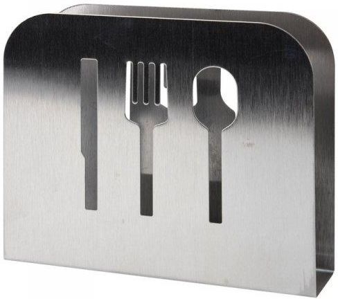 Nowoczesny serwetnik wykonany ze stali nierdzewnej z wyciętymi laserowo ikonami sztućcy. Materiał: stal nierdzewna Wymiary: szerokość 15 cm, długość 5 cm, wysokość 12,5 cm, Szczegóły: - Nowoczesny serwetnik ze wzorem sztućców. - Pozwala na przechowywanie serwetek na stole, zawsze pod ręką.