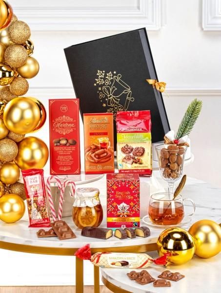 Elegancki kosz świąteczny ze słodyczami Elegancki kosz świąteczny ze słodyczami Zestaw zawiera: Eleganckie, czarne pudełko, które dodaje ekskluzywnego charakteru upominkowi. Pudełko uzupełnione przepiękną świąteczną grafiką, której estetyka została podkreślona poprzez zastosowanie hot-stampingu, dzięki któremu motywy świąteczne na wieczku pudełka nabrały trójwymiarowego wyglądu i lśniącego efektu. Pudełko zamykane jest w formie książki i ozdobione zostało złotą wstążką tworząc niezwykłą całość eleganckiego prezentu. Wyjątkowa mieszanka czarnej herbaty z aromatycznymi przyprawami łączy w sobie tradycję herbaty Ceylon z wyjątkowymi smakami i aromatami Bożego Narodzenia. Głównym składnikiem tej herbaty jest wysokiej jakości czarna herbata pochodząca z Ceylonu. Cynamon dodaje nuty korzenne i ciepłe, przypominające piernik. Kakao wprowadza delikatną czekoladową słodycz. Kokos nadaje herbatce subtelny tropikalny smak. Imbir i kurkuma dodają pikantności i rozgrzewających nut. Goździki dostarczają intensywnego aromatu, a pieprz dodaje lekkiego ostrygości. Hibiskus wzbogaca mieszankę o lekko kwasowy smak i intensywną czerwoną barwę. To idealna herbata na chłodne zimowe dni i wieczory. Możesz ją delektować się samą w ciszy, w towarzystwie bliskich przy kominku lub jako towarzysza podczas świątecznych spotkań.; English Tea Shop Christmas 50g Cytrynki z imbirem w miodzie to doskonały dodatek, który doskonale łączy w sobie smak cytryn, imbiru i miodu. Cytrynki z imbirem w miodzie mają świeży i owocowy aromat cytrusów, który jest równoważony delikatnym, pikantnym zapachem imbiru. Smak jest harmonijny - cytrynki nadają naturalną kwasowość i orzeźwienie, imbir dodaje lekkości i ciepła, a miód dosładza i wygładza całość. To przekąska, która doskonale nadaje się na słodki dodatek do herbaty lub kawy.; Ogródek Dziadunia 270g Czekolada bożonarodzeniowa Lindt to prawdziwa świąteczna uczta, która łączy w sobie tradycyjny smak świątecznego ponczu z doskonałą jakością czekolady. Delikatne nadzienie ma intensywny smak cynamonu, który rozgrzewa i nadaje świąteczny charakter. Jest ono gładkie, kremowe i doskonale wtapia się w smak całości.; Lindt 100g Karmelizowane migdały z wyśmienitą 70% ciemną czekoladą Gianduja, obsypane kakaem, to wyjątkowa przekąska. To luksusowa przekąska, która łączy w sobie kontrastujące smaki i tekstury, tworząc wyjątkowe doznania smakowe. Przysmak ten jest produkowany przez hiszpańską manufakturę, może pochwalić się 25-letnim doświadczeniem, które sięga początków działalności tej rodzinnej firmy. To właśnie dzięki ich ciągłemu zaangażowaniu, tradycji i pasji do tworzenia doskonałych produktów, ten wyjątkowy smakołyk zdobył sobie uznanie wśród smakoszy na całym świecie.; Mi&Cu 80g Chrupiące wafelki przekładane delikatnym kremem z orzechów laskowych, oblany mleczną czekoladą, w której zostały zatopione kawałki orzechów laskowych.; Pischinger Haselnuss Ecken 120g Batonik orzechowy, który opiera się na zdrowych orzechach, które są źródłem wartościowych składników odżywczych. W jego skład wchodzą różne rodzaje orzechów, takie jak migdały, orzechy włoskie, orzechy laskowe czy orzeszki ziemne.; Nut Bar 30g Czekolada deserowa z nadzieniem marcepanowym (75%). Zentis to delikatny marcepan w aksamitnej deserowej czekoladzie w formie batonika; Zentis 100g Lizak w kształcie laski świątecznej, który jest popularnym elementem słodkich upominków i dekoracji podczas okresu świąt Bożego Narodzenia. Ten kolorowy i ozdobny lizak przypomina tradycyjną laskę cukrową, ale wzbogacony jest świątecznym motywem, który nadaje mu unikalnego uroku. Zestaw nie zawiera: Bombek, kieliszków, talerzy i innych dekoracji prezentowanych na zdjęciach, nie wymienionych w opisie składu zestawu.