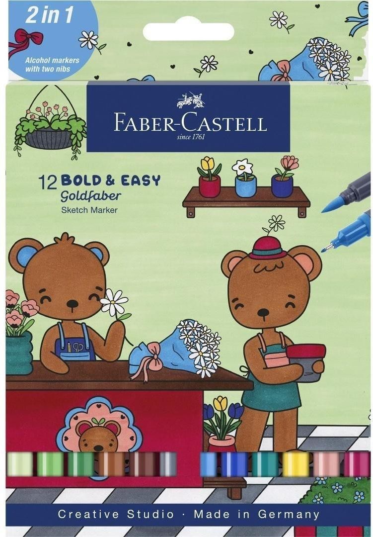 Zestaw pisaków dwustronnych Goldfaber Sketch Faber-Castell 12 szt.z serii Bold & Easy. Doskonałe dla artystów i hobbystów, zachwycają wszechstronnością zastosowania. Zapewniają łatwe blendowanie bez smug i tworzenie idealnych przejść kolorystycznych. Posiadają dwie końcówki: miękką, elastyczną końcówkę pędzelkową do zadań artystycznych i cienką końcówkę 0,6 mm do konturów i detali. Z szybkoschnącym i permanentnym tuszem na bazie alkoholu. Zatyczki i korpus są wykonane w 100% z materiału pochodzącego z recyklingu, w związku z czym mogą pojawić się niewielkie różnice kolorystyczne.