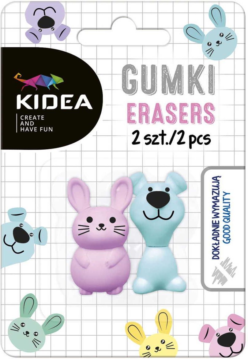 Ten zestaw gumek do mazania zdecydowanie zachwyci każdego! Zestaw zawiera przeuroczego króliczka w fantastycznym różowym kolorze oraz pieska o odcieniu turkusowym. Razem tworzą duet idealny! Rozczulają do granic możliwości... To świetna propozycja dla dzieci dużych i małych! Doskonale wymazują i korygują rysunki, nie niszcząc papieru i nie rozmazując. Marka Kidea Marka artykułów szkolnych i plastycznych dla dzieci powstała w oparciu o nasze długoletnie branżowe doświadczenie, jako odzwierciedlenie pasji tworzenia i fascynacji dziecięcą wyobraźnią. Cudowne połączenie niczym nieskrępowanej, kolorowej fantazji dzieci z ich niesamowitymi zdolnościami kreatywnymi skłoniło nas do pracy nad projektem Dziecko + Pomysł (KID + IDEA). Z dumą profesjonalistów, chcielibyśmy zapewnić, że nasze produkty cechują się najwyższą jakością i bezpieczeństwem, a jednocześnie spełniają potrzeby naszych najmłodszych Klientów. Mali eksperci docenią łatwość pisania, malowania i rysowania naszymi produktami, które dostosowane są do ich twórczych rączek. Natomiast szeroka gama intensywnych kolorów naszych produktów podkreśli ich uczucia, pozwoli łatwiej wyrazić emocje i lepiej skomunikować się z otaczającym, jeszcze nie do końca odkrytym światem. Otoczenie dziecka to niewyobrażalnie bogata kraina baśni, pełna ciekawych pomysłów, zabaw i kolorów, a KIDEA, dzięki szerokiej gamie produktowej, chce ten świat współtworzyć i pomóc go upiększać.