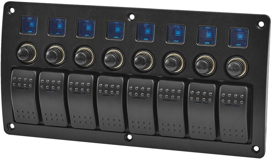 Panel sterowania podświetlany diodami LED! Osiem przełączników z automatycznymi bezpiecznikami. Etykiety w zestawie. Wstępnie okablowany, co ułatwia montaż.