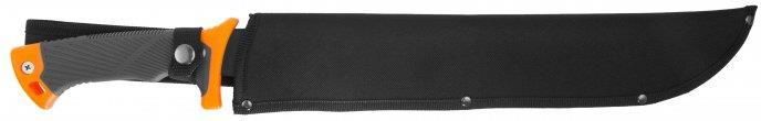 Maczeta nóż Joker Tropicano JKR489 Black Maczeta z grubej, nierdzewnej stali, hiszpańskiej marki JOKER - znanej na całym świecie ze swoich doskonałych wyrobów. Firma Joker słynie z solidnych i trwałych narzędzi, stworzonych wprost do ciężkiej pracy. Model Tropicano JKR489 stanowi przede wszystkim wielofunkcyjny, duży nóż użytkowy, przeznaczony do zadań survivalowych, takich jak: rabanie, cięcie, karczowanie. Klingę wykonano z nierdzewnej stali, zahartowanej na poziomie 55-57 HRC oraz zabezpieczono przed korozją czarną powłoką ochronną. Jest fabrycznie naostrzona i gotowa do pracy. Wygodną rękojeść z twardego tworzywa sztucznego pokryto gumą, co gwarantuje pewny chwyt w każdych warunkach. W końcowej części rękojeści znajduje się otwór na linkę zabezpieczającą. W komplecie funkcjonalny pokrowiec, który umożliwia bezpieczne przenoszenie maczety. Pokrowiec wykonany został z nylonu i posiada możliwość zamontowania na pasku. Cechy produktu typ noża: stała klinga - full tang zastosowanie (przeznaczenie): survivalowe, terenowe typ stali ostrza: stal nierdzewna materiał rękojeści: tworzywo sztuczne + guma materiał pokrowca: nylon długość ostrza: 37 cm długość całkowita: 53 cm waga: 670 g producent (marka): JOKER, Hiszpania model: JKR489 kod produktu: 060-224