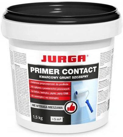 JURGA Primer Contact 7kg – kwarcowy grunt szczepny | do betonu, płytek, OSB, pod hydroizolacje i tynki | wewnętrzny i zewnętrzny | mrozoodporny Jurga Primer Contact to gotowy do użycia preparat gruntujący, który dzięki zawartości kruszywa kwarcowego wzbogaca powierzchnię i znacząco poprawia przyczepność kolejnych warstw materiałów. Jego innowacyjna formuła charakteryzuje się dodatkiem piasku kwarcowego, co sprawia, że niezwykle skutecznie zwiększa szorstkość podłoża. Produkt ten znajduje zastosowanie zarówno w przypadku podłoży mieszanych, wyrównując i regulując ich chłonność. Zalety Produktu Zwiększona przyczepność: Dzięki obecności kruszywa kwarcowego, Primer Contact tworzy warstwę o wysokiej przyczepności, co zapewnia solidną bazę dla kolejnych warstw materiałów. Uniwersalne zastosowanie: Preparat jest specjalistycznym rozwiązaniem do gruntowania gładkich powierzchni betonowych lub innych materiałów mineralnych, takich jak płytki ceramiczne czy kamień. Może być stosowany zarówno wewnątrz, jak i na zewnątrz pomieszczeń. Pod różne materiały: Produkt jest rekomendowany do podłoży murowanych, stabilizowanych płyt OSB, płyty gipsowo-włóknowe, płyty gipsowe i cementowe, beton komórkowy, żelbet, tynki itp. Wsparcie dla innych warstw: Primer Contact jest polecany jako podkład pod powłoki hydroizolacyjne z serii JURGA IZOMASS i JURGA FOLMIX. Stanowi niezbędne przygotowanie podłoża drewnianego, płyty OSB pod folię hydroizolacyjną Folmix Plus. Zastosowanie Primer Contact jest dedykowany do gruntowania podłoży przed nakładaniem kolejnych warstw. Jest idealny do gładkich powierzchni betonowych oraz niechłonnych materiałów mineralnych, takich jak: płytki ceramiczne kamień Może być stosowany na: powierzchniach murowanych, płytach OSB, płytach gipsowych, gipsowo-włóknowych, cementowych, betonie komórkowym, tynkach itp. Możliwe jest także jego wykorzystanie w pomieszczeniach pod masy wyrównujące, naprawcze, samopoziomujące, wylewki betonowe, kleje, tynki itp. Sposób użycia Preparat jest gotowy do użycia i nie wymaga rozcieńczania wodą ani żadnymi innymi materiałami. Primer Contact nakłada się pędzlem lub wałkiem. Gruntowanie powinno odbywać się w temperaturze podłoża i otoczenia od +5°C do +25°C. Czas schnięcia jednej warstwy wynosi 3-6 godzin w temperaturze 23°C i przy wilgotności powietrza wynoszącej 60%. Po zastosowaniu narzędzia oraz ewentualne zabrudzenia należy dokładnie umyć wodą. Przy pracach na zewnątrz zaleca się ochronę zagruntowanej powierzchni przed opadami atmosferycznymi i mrozem. Wydajność Średnie zużycie preparatu wynosi od 0,1 do 0,20 l/m², jednak ostateczna wydajność zależy od rodzaju i chłonności podłoża. Przechowywanie Preparat powinno się przechowywać w suchym i zacienionym miejscu, w oryginalnych szczelnie zamkniętych pojemnikach, w temperaturze od +5°C do +25°C. Okres przydatności Produkt zachowuje swoje właściwości przez 18 miesięcy od daty produkcji, którą można znaleźć na opakowaniu. Data produkcji jest numerem partii. ECO Formuła Produkt wyróżnia się swoją ekologicznością, gdyż nie zawiera szkodliwych rozpuszczalników ani benzyn. Bezpieczna formuła produktu minimalizuje emisję szkodliwych związków, co jest korzystne zarówno dla użytkowników, jak i środowiska. Wybierając folie w płynie Jurga In, dbasz o zdrowie i bezpieczeństwo swoje i otoczenia. Polski produkt ‘’Jurga Primer Contact’’ to produkt, który w całości jest produkowany w Polsce. Lokalna produkcja umożliwia nadzór nad jakością i elastyczność w odpowiedzi na potrzeby klientów. Wybierając polski produkt, wspieramy rodzimą gospodarkę i promujemy innowacyjność i jakość marek pochodzących z Polski. To także okazja do rozwoju branży budowlanej.