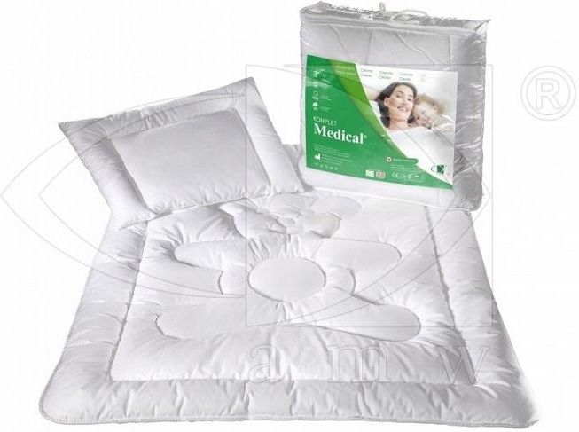 Kołdra dziecięca 110x140 w zestawie z poduszką 40x60 Medical® doskonale spełnia najwyższe wymagania jakościowe i użytkowe. Pranie w wysokich temperaturach eliminuje szkodliwe dla człowieka drobnoustroje. Jest zatem idealna dla osób ze skłonnościami alergicznymi. Medical jest szczególnie polecany dla hoteli i pensjonatów jako towar niezwykle trwały i odporny na długi okres użytkowania. Skład zestawu: - kołdra dziecięca Medical 110x140 - 1 szt. - poduszka dziecięca Medical 40x60 płaska - 1 szt. Kolekcja: Medical® Kolor: biały Skład tkaniny: 52% poliester, 48% bawełna Wypełnienie kołdry: 100% poliester silikonowany Hollow® Właściwości wypełnienia kołdry: włókna poliestrowe Hollow, termicznie skręcane, posiadające spiralny kształt i wysoką sprężystość, zapewniają doskonałą izolację cieplną i puszystość. Sprawiają, że skóra podczas snu może oddychać, jednocześnie przeciwdziałając osadzaniu się kurzu. Włókna charakteryzują się właściwościami antyalergicznymi i zapewniają łatwość prawidłowego utrzymania higieny. Gramatura wypełnienia kołdry: 600g Wypełnienie poduszki: 100% poliester Amball® (kulki poliestrowe) Właściwości wypełnienia poduszki: kulki poliestrowe Amball® dorównują pod względem lekkości, miękkości i sprężystości naturalnemu puchowi. Posiadają właściwości antyalergiczne oraz przeciwdziałają osadzaniu się roztoczy kurzu. Dobrze przepuszczają powietrze, a podczas użytkowania nie zbijają się. Gramatura wypełnienia poduszki: 300g Zalecenia dotyczące użytkowania: - prać w temperaturze 95°C, - nie wybielać, - można suszyć mechanicznie, - nie prasować, - nie czyścić chemicznie, - systematycznie wietrzyć, - codziennie strzepnąć. WYRÓB MEDYCZNY Wszystkie produkty medyczne firmy AMW zostały potwierdzone pozytywną opinią kliniczną oraz Świadectwem Jakości Instytutu Leków w Warszawie PL/CA01 04605/W. PRODUKT ANTYALERGICZNY Zestaw zmniejsza ryzyko rozwoju roztoczy i ich alergenów, co potwierdziły badania laboratoryjne. Opinia kliniczna wydana przez 22 Szpital Wojskowy Szpital Uzdrowiskowo- Rehabilitacyjny SP ZOZ – Ośrodek ”JUBILAT”, 87-720 Ciechocinek, ul. Wojska Polskiego 5. Produkt posiada certyfikat: - Tekstylia Godne Zaufania zbadane na substancje szkodliwe według OEKO-TEX® Standard 100. Opakowanie: elegancka torba z rączką, umożliwiająca bezpieczny transport i przechowywanie.