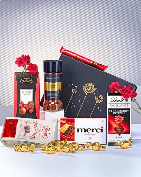 Kosz prezentowy wypełniony słodyczami m.in. batonem w formie sticka, czekoladą, pralinami oraz kawą. Idealny zestaw na podziękowanie bądź urodziny. Zestaw zapakowany jest w eleganckie czarne pudełko z wypełnieniem, przyozdobione wstążką. Wymiary pudełka: 31x21x8cm W skład zestawu wchodzi: Pudełko wykonane z grubej tektury i papieru ozdobnego, ozdobione tłoczonymi, złotymi detalami UWAGA WYMIANA Na białe pudełko - zdjęcie poniżej Czekolada Merci. Gorzka czekolada z pysznym nadzieniem z marcepanu. Merci 100g Praliny z kawałkami orzechów w mlecznej czekoladzie 85g Szwajcarska deserowa czekolada z kawałkami truskawek Lindt 100g Wyselekcjonowana, rozpuszczalna kawa Fine Aroma Davidoff 100g Praliny, kakaowe kulki; Excelcium 120g Baton w formie sticka z mlecznej czekolady z delikatnie rozpływającym się kremem Lindt 38g