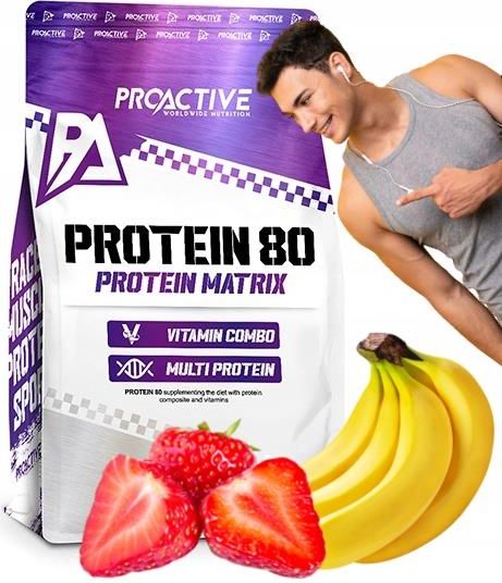 ProActive Protein 80 - 700g SMAK CZEKOLADA ORZECHOWA ProActive Protein 80 to najwyższej jakości odżywka białkowa, która w składzie posiada szereg białek o różnej przyswajalności: koncentrat białka serwatki, hydrolizat białka pszenicznego, białka mleka. Zawartość wzbogacona została dodatkowo o idealnie skomponowaną porcję witamin. Zawiera Witaminy ProActive Protein to także kompleks witamin w doskonale wymierzonych proporcjach. Za sprawą tego kompleksu dochodzi do poprawy metabolizmu energetycznego, regeneracji komórek, produkcji czerwonych krwinek a nawet do ochrony przed szkodliwymi wolnymi rodnikami. W składzie występują takie witaminy jak: Witamina C – pomocną w procesie tworzenia kolagenu, działającą korzystnie na układ nerwowy i odpornościowy; Witamina E – chroniącą DNA, białka i lipidy przed wolnymi rodnikami; Kompleks witamin z grupy B – dla zdrowia metabolizmu białek, prawidłowego pozyskiwana energii w procesach metabolicznych, zmniejszaniu zmęczenia, pozytywnego działania na układ odpornościowy i nerwowy, wspomaganiu funkcji psychicznych i wielu innych. Kompleks białkowo-witaminowy, który został stworzony z myślą o osobach ze zwiększonym zapotrzebowaniem na proteiny i witaminy takich jak sportowcy i osoby intensywnie trenujące, Sposób użycia 1 porcję produktu (30 g) wymieszać z 250 ml wody. Spożywać do 3 razy dziennie. Nie przekraczać maksymalnej ilości 3 porcji (90 g) do spożycia dziennie. Miarka załączona do opakowania. Skład Składniki: mieszanina białek (składająca się z koncentratubiałek serwatki 43%,hydrolizat białka pszenicznego 43%, izolat białka sojowego, białka mleka 14%), kakao w proszku o obniżonej zawartości tłuszczu, aromat, regulator kwasowości: kwas cytrynowy, kwas L-askorbinowy, amid kwasu nikotynowego, octan DL-alfa-tokoferylu, D-pantotenian wapnia, mono-azotan tiaminy, ryboflawina, chlorowodorek pirydoksyny, D-biotyna, kwas pteroilomonoglutaminowy, cyjanokobalamina, emuglator: lecytyny(sojowabez GMO), substancje słodzące: acesulfamK i sukraloza, barwnik: burak czerwony w proszku (dla smaku truskawkowego), beta karoten (smak wanilia, banan, ciastko), karmel w proszku (smak karmel, czekolada orzech), ekstrakt zczarnej marchwi ( smaku waniliowo-jagodowy). Znaczenie Jedna porcja produktu zawiera aż 23,4 grama białka! Dzięki tak wysokiej dawce protein suplement zapewni Ci prawidłową regenerację mięśni po wycieńczającym treningu. Ponadto działa antykatabolicznie, czyli zapobiega rozpadowi mięśni. Produkt odznacza się wysoką biodostępnością, stąd szybko i skutecznie dostarcza składników odżywczych do mięśni, co przekłada się na późniejsze osiągnięcia. ProActive Protein 80 najlepiej stosować tuż po treningu, kiedy mięśnie wykazują największe zapotrzebowanie na składniki odżywcze. Wówczas natychmiastowo chłoną białko, co przyczynia się do natychmiastowego pobudzenia anabolizmu białek mięśni oraz maksymalnego wzrostu energii mięśniowej, co przełoży się na późniejsze efekty treningowe.* *Efekty zależą od indywidualnych predyspozycji Dla kogo? ProActive Protein to produkt przeznaczony zarówno dla profesjonalnych sportowców, jak i osób uprawiających sport amatorsko, którzy pragną uzupełnić niedobory białka i witamin. Odżywka ta pozwoli maksymalnie odżywić mięśnie, dzięki czemu nastąpi przyrost suchej masy mięśniowej oraz utrzymasz je w prawidłowym zdrowiu. Wartość odżywcza 100g / 30g Wartość Energetyczna 379 kcal/1607 KJ / 114 kcal/481 KJ Tłuszcze 3,7g / 1,1g w tym kwasy tłuszczowe nasycone 2,1g / 0,6g Węglowodany 8,1g / 2,4g w tym cukry 5,4g / 1,6g Błonnik 0,8g / 0,24g Białko 78g / 23,4g sól 1,4g / 0,42g MIARKA GRATIS Razem z naszą odżywką białkową otrzymasz gratisową miarkę do precyzyjnego odmierzania porcji produktu. Dzięki temu będziesz mógł dokładnie kontrolować swoje spożycie i osiągnąć jeszcze lepsze rezultaty treningowe. Marka ProActive ProActive to znany i ceniony producent suplementów diety. Każdy produkt stworzony jest w taki sposób, aby jak najlepiej odpowiadał potrzebom doświadczonych sportowców. Suplementy diety ProActive to doskonała propozycja zarówno dla osób, które trenują od dawna, jak i do tych, którzy stawiają pierwsze kroki na sportowej ścieżce. ProActive oferuje Ci mnóstwo zróżnicowanych odżywek, w tym białka, BCAA, aminokwasy, kreatynę i wiele, wiele innych. ProActive jest dumnym przedstawicielem polskiego przemysłu suplementów diety, kupując nasze produkty, nie tylko inwestujesz w swoje zdrowie i dobre samopoczucie, ale również wspierasz rodzime przedsiębiorstwo, które promuje innowacyjność i jakość na światowym rynku. UWAGI Suplementy diety nie mogą być stosowane jako substytut (zamiennik) zróżnicowanej diety i zdrowego trybu życia. Suplementy diety powinny być przechowywane w sposób niedostępny dla małych dzieci. Produkt przeznaczony dla dorosłych i zdrowych osób. Produkt nie powinien być stosowany przez kobiety w ciąży i matki karmiące.