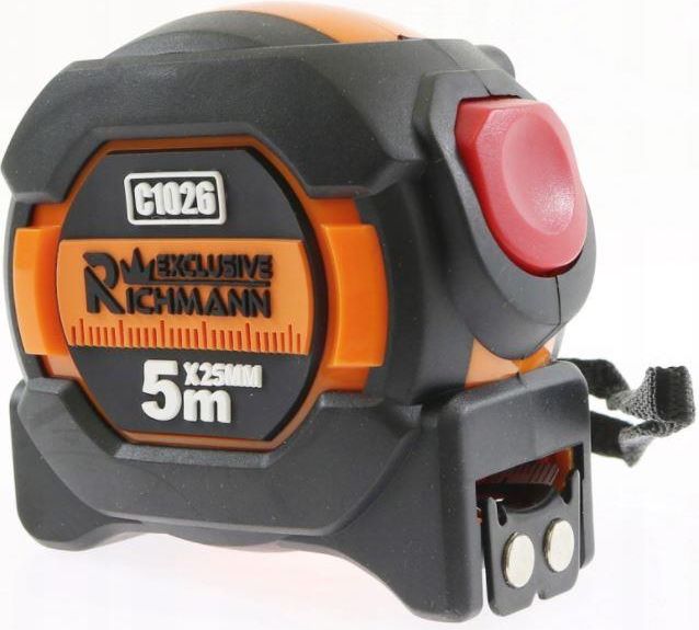 Profesjonalna miara dwustronna zwijana o wymiarach 5 m x 25 mm z I klasą dokładności. Richmann C1026 Wyposażona w mechanizm automatycznego blokowania „AUTO-STOP” taśmy podczas rozwijania. Wyraźne cyfry oraz dobrze widoczna podziałka. Taśmę możemy zwinąć wciskając specjalny przycisk zwalniający blokadę, umieszczony w czołowym odcinku korpusu. Mechanizm zwijania działa błyskawicznie i płynnie. Na początku taśmy znajdują się mocne magnesy neodymowe, ułatwiające rozpoczęcie pomiaru z metalowych elementów. Zaczep z otworem rozpoczynający pomiar został solidnie przymocowany trzema nitami. Specjalna konstrukcja miarki chroni dłoń przed zranieniem podczas zwijania. Pokryta nylonem zapobiegającym załamaniom oraz ułatwiającym odczyt w słoneczny dzień. Powłoka nylonowa dodatkowo zapobiega powstawaniu korozji czy wycieraniu podziałki. Miara posiada nylonowy pasek na nadgarstek wykonany z mocnego tworzywa. Ergonomiczny kształt pokryty antypoślizgową gumą ABS. Wyposażona w metalowy zaczep do paska. Solidna jakość wykonania gwarantuje długotrwałe użytkowanie. Miarka spełnia wszelkie normy europejskie CE. Dane techniczne Rodzaj: Miara zwijana Długość: 5 m Szerokość: 25 mm Klasa dokładności: I Powłoka: nylon System AUTO-STOP: tak Dwustronna taśma: tak Ochrona palców: tak Normy: CE Waga: 0.29 kg Główną serią produktów oferowanych przez nas są narzędzia marki RICHMANN oraz RICHMANN EXCLUSIVE. Wyróżniają się one najwyższą jakością, nieprzeciętnym wzornictwem i bardzo dobrym stosunkiem jakości do ceny.Produkty serii "Exclusive" wykonane są z najwyższej jakości materiałów i są przeznaczone do zastosowań profesjonalnych oraz przemysłu.