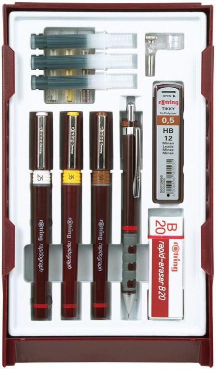 Profesonalne rozwiązanie dla uczniów i studentów uczelni technicznych College Set W zestawie: 3 x rapidografy o grubościach 0.25/0.35/0.5 1 bordowy Tikky 0.5 12 grafitów hi-polimerowych HB 1 gumka B20 3 naboje 1 nasadka kombi do cyrkla