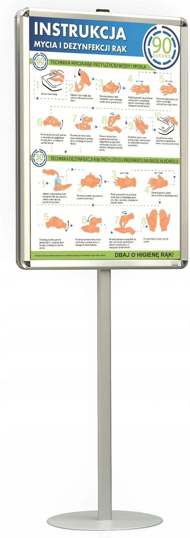 Aluminiowa tablica informacyjna zatrzaskowa w profilu 32 mm w kolorze srebrnej anody. Dostępna w wersji jednostronnej lub dwustronnej. Tablica zawiera elastyczną folię antyrefleksyjną z filtrem UV, która tłumi refleksy światła, a tym samym chroni plakat przed jego blaknięciem. Rama posiada plastikowe zaokrąglone głowice narożnikowe. Podstawa wykonana ze stali. Do zastosowania wewnątrz budynku. Specyfikacja techniczna Wymiar plakatu: 594 x 841 mm Waga: 10 kg Średnica podstawy: 33 cm Gwarancja: 2 lata.