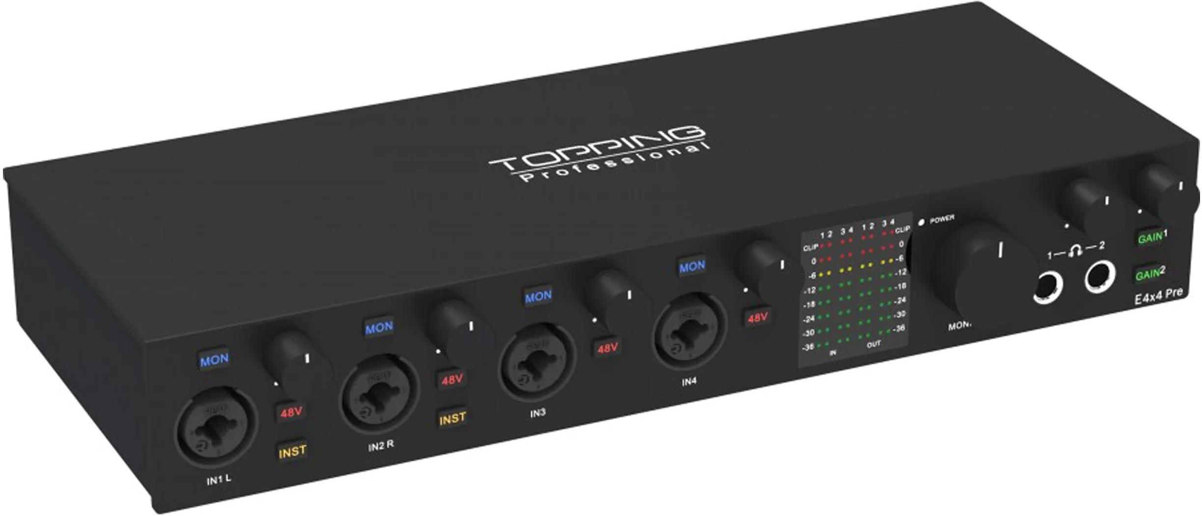 Profesjonalny studyjny interfejs USB audio Topping E4x4 Pre - Czarny Zaawansowany interfejs audio z wbudowanym przedwzmacniaczem mikrofonowym, zaprojektowany z myślą o profesjonalnych zastosowaniach, takich jak nagrania studyjne lub transmisje na żywo. Dzięki połączeniu doskonałej jakości dźwięku i …
