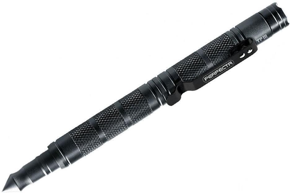 Długopis taktyczny Perfecta: poręczny i uniwersalny. Jest to nie tylko wytrzymały długopis, ale także narzędzie, którym możesz rozbić szkło lub się obronić. Noś go przy sobie i poczuj się bezpiecznie. Model TP III jest dodatkowo wyposażony w podświetlenie LED.   Kod producenta 2.1992   Dane techniczne:   długość całkowita - 175 mm waga - 52 g bateria CR927 w komplecie