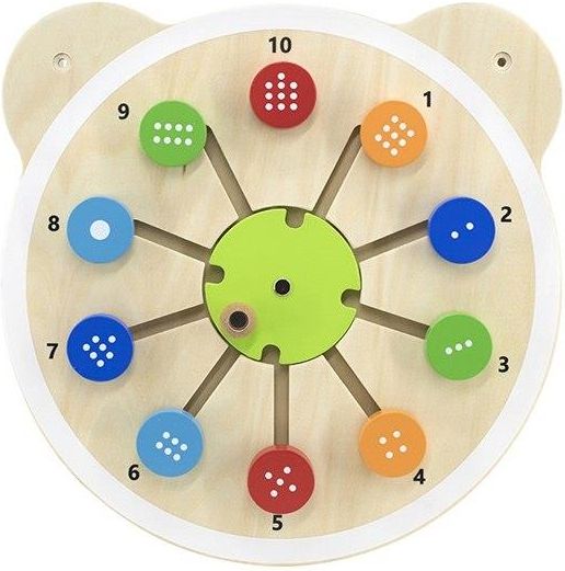 Jedna z serii drewnianych tablic z uroczą głową misia. Tablica z okrągłymi klockami, na których znajduje się odpowiednia liczba kropek, które należy dopasować do odpowiedniej cyfry na tablicy. Zabawka pomaga w rozwijaniu logicznego myślenia u dzieci, pomaga również w nauce kolorów i liczb. Produkt idealnie sprawdzi się zarówno w domowym zaciszu, jak i w placówkach oświatowych, wczesnoszkolnych. Ciekawe przygotowanie formy tablicy z pewnością przykuje uwagę każdego malucha. Całość wykonana została z drewna lakierowanego i pomalowana nietoksycznymi farbami w żywe barwy, które zadowolą każdego użytkownika i dadzą mnóstwo radości z zabawy. Produkt przeznaczony dla dzieci od 18 miesiąca życia. W naszej ofercie dostępna jest cała seria tablic z głową misia.Charakterystyka: - tablica ścienna w kształcie głowy misia - zabawa polega na przesuwaniu okrągłych klocków tak, aby dopasować odpowiednią liczbę kropek na klocku do odpowiedniej cyfry na tablicy - całość wykonana została z drewna lakierowanego - pomalowana nie toksycznymi farbami w żywe barwy - w naszej ofercie dostępna cała seria tablic w kształcie głowy misia z różnymi funkcjami Zabawka : - rozwija zdolność logicznego myślenia - pomaga w nauce kolorów - pomaga w nauce cyfr - rozwija zdolności manualne u dziecka Ekozabawki skierowane są już dla najmłodszych dzieci, które wykonuje się z całkowicie naturalnych, biodegradowalnych oraz hipoalergicznych materiałów, dzięki czemu są one w stu procentach bezpieczne i nieszkodliwe nie tylko dla samego środowiska, ale także i dla Twojej pociechy.