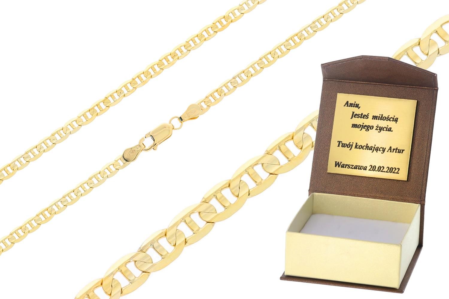 Wymiary: Szerokość 4 mm Złoty łańcuszek przedstawiony w naszej ofercie został wykonany z wysokiej jakości złota próby 585. Biżuteria została stworzona z pasją i wielką precyzją, aby zapewnić komfort jej użytkowania. W ofercie posiadamy bardzo duży wybór łańcuszków zarówno pod względem wagi jak również splotu. Dostępne są łańcuszki pełne, solidnie zrobione jak również puste w środku, dzięki czemu osiągają niższą cenę. Posiadamy łańcuszki żółte, białe oraz żółte z elementami białego złota.