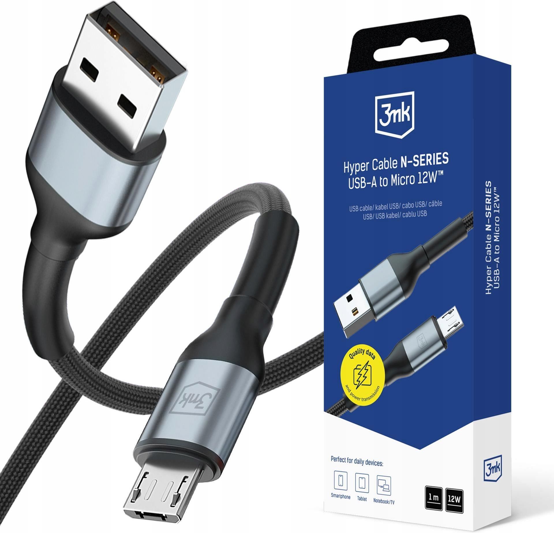 Czarny Kabel 3mk Hyper Cable N-SERIES A to Micro 1m 12W do iPhone Samsung Uniwersalna kompatybilność Hyper Cable N-SERIES USB-A to Micro 12W™ obsługuje szeroką gamę urządzeń wyposażonych w złącze micro USB. Od powerbanków i głośników Bluetooth, przez kamery sportowe, oświetlenie LED, aż po mniejsze …