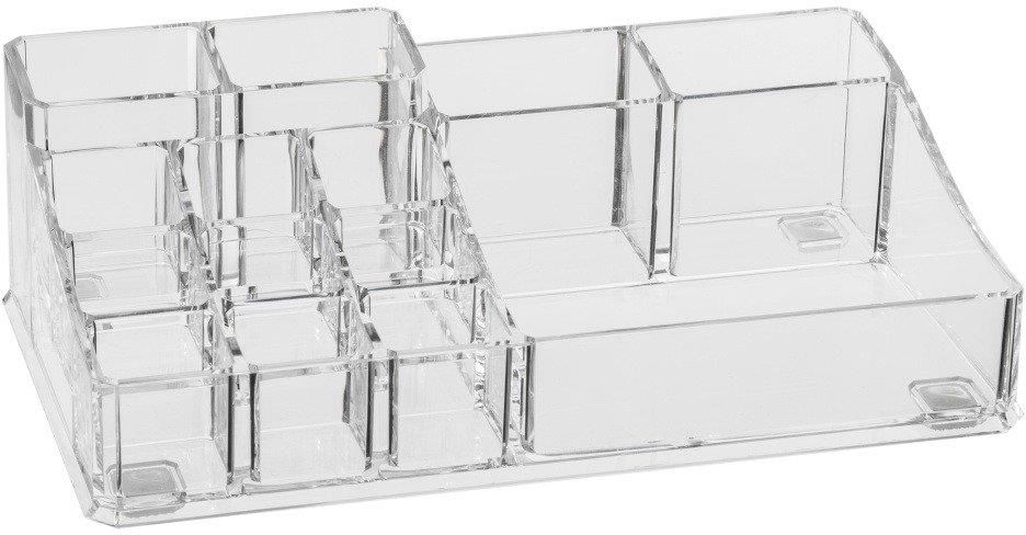 Organizer Selena to doskonałe rozwiązanie dla miłośniczek makijażu, które pragną utrzymać porządek w swojej kolekcji kosmetyków. Ten funkcjonalny i stylowy organizer został stworzony z myślą o efektywnym przechowywaniu różnorodnych produktów do makijażu, zapewniając jednocześnie łatwy dostęp do ulubionych kosmetyków. Organizer Selena — uporządkuj swoje kosmetyki i zapewnij sobie komfort podczas codziennego makijażu Organizer posiada liczne przegródki, półki i miejsce na pędzle, co umożliwia uporządkowanie i wygodne przechowywanie podkładów, cieni, pomadek, a także innych niezbędnych produktów do makijażu. Dzięki temu, wszystko jest na wyciągnięcie ręki, co ułatwia codzienną rutynę pielęgnacji i makijażu. Design organizera Selena łączy w sobie funkcjonalność z elegancją. Wykonany z trwałego materiału, nadaje się do codziennego użytku, a jednocześnie prezentuje się stylowo i nowocześnie. Przejrzyste przegrody pozwalają szybko zlokalizować potrzebny produkt, a dodatkowo dodają estetyki całej przestrzeni. Organizer jest kompaktowy, co sprawia, że łatwo zmieści się na toaletce, w łazience czy na półce. Jego uniwersalny design sprawia, że doskonale pasuje do różnych aranżacji wnętrz, dodając im subtelnego uroku. Organizer Selena Make-up to nie tylko praktyczne narzędzie do przechowywania kosmetyków, ale również element dekoracyjny, który podkreśla pasję do makijażu i dbałość o porządek. Zainstaluj go w swojej przestrzeni do pielęgnacji urody, aby cieszyć się uporządkowanym i stylowym miejscem do tworzenia swoich ulubionych looków. O tym warto pamiętać! uniwersalny design 14 przegródek umożliwia zorganizowanie kosmetyków z łatwością ustawisz go na toaletce, biurku czy w szafce