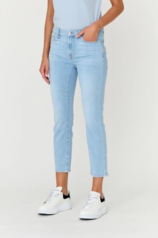 Błękitne damskie jeansy ROXANNE ANKLE WIND CATCHER marki 7 FOR ALL MANKIND. Wykonane z wyjątkowo przyjemnego materiału. Wymiary modelki: Wzrost: 176 cm, biust: 85 cm, talia: 65 cm, biodra: 92 cm. Modelka ma na sobie produkt w rozmiarze 29.