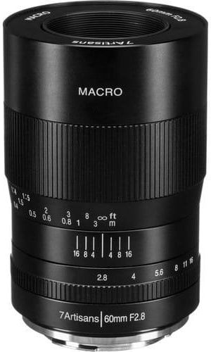 Dane techniczne: Ogniskowa: 60 mm Maksymalna wartość przesłony: f/2,8 Minimalna wartość przesłony: f/16 Pole widzenia: 25 ° Matryca: APS-C Minimalna odległość ostrzenia: 26 cm Liczba listków przysłony: 10 Konstrukcja optyczna: 8 elementów w 7 grupach Średnica filtra: 39 / 37 mm Ustawianie ostrości: Manualne (MF) Wymiary: 63 x 62mm Waga: 550 g Mocowanie: Canon EOS-m 7Artisans 60mm f/2,8 Macro jest manualnym obiektywem makro przeznaczonym dla osób chcących rozpocząć przygodę z makrofotografią. Oferuje maksymalne powiększenie 1:1 oraz minimalną odległość ostrzenia na poziomie 26 cm. System wewnętrznego pływania elementów optycznych daje użytkownikom wysoką ostrość i klarowność obrazu w całym zakresie kadru. Obiektyw dysponuje płynną regulacją przysłony zapewniający cichy i płynny obrót pierścienia wymagany w przypadku prac filmowych. Dodatkowym atutem obiektywu jest konstrukcja przysłony składająca się z 10 listków dzięki czemu rozmycie tła (bokeh) jest bardzo przyjemne. Obiektyw dostępny jest dla aparatów Canon M, EOS R, Fuji X, Nikon Z, MFT i Sony E. Specyfikacja: ogniskowa – 60mm światłosiła – f/2,8 pole widzenia – 25 ° minimalna odległość ostrzenia – 26cm liczba listków przysłony – 10 konstrukcja optyczna – 8 soczewek w 7 grupach średnica filtra – 39mm wymiary – 100x66mm waga – 550g