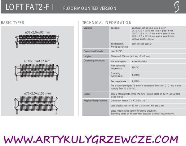 Producent: AG Grzejniki Design Model: FA2-F Medium Tube Średnica rury / Głębokość (mm): 57 / 137 Wyskość z nogami (mm): 374 Długość (mm): 3000 Podłączenie (mm): Boczne Skrajne Moc grzewcza: 2534 W (75/65/20 ) Moc grzewcza: 2027 W (70/55/20) Gwarancja : 10 lat Czas realizacji : Od 4 do 6 tygodni Grzejnik o surowym fabrycznym designie idealny do loftów i nowoczesnych apartamentów - Projektowane przez uznanych architektów !!! O FIRMIE AG Grzejniki Design - firma została założona w 2005 roku i specjalizuje się w produkcji grzejników dekoracyjnych i desigerskich . Doskonała jakość jest motorem działalności firmy. Opierając się na zaawansowanej technologi produkcji oraz na współpracy z najlepszymi ,światowej sławy projektantami takimi jak : Karim Rashid, Marco Zito, Peter Jamieson ,twożą produkty ,które w płynny sposób przechodzą od użyteczności do sztuki. W ofercie firmy znajduję się ponad 100 modeli podzielonych na pięć kolekcji : Exellent , Art Deco , Designer , Exclusive , Loft . ZASTOSOWANIE : Grzejnik został zaprojektowany specjalnie dla najbardziej wymagających klientów ceniących zarówno klasyczne jak i nowoczesne wnętrza Pod względem wydajności cieplnej, zapewnienia maksymalnej wydajności cieplnej i zaoszczędzenie znacznej ilości energii, dzięki bardzo ograniczonej zawartości wody i małej bezwładności cieplnej. Minimalistyczny desing, oraz tradycyjna forma wyróżnia go spośród innych grzejników dekoracyjnych. Idealnie pasuje do luksusowych apartamentów i domów . Pod względem wydajności cieplnej, grzejniki AG zapewnienia maksymalnej wydajności cieplnej i zaoszczędzenie znacznej ilości energii, dzięki bardzo ograniczonej zawartości wody i małej bezwładności cieplnej. Ich skuteczność jest gwarantowana nawet w niskich temperaturach, np. gdy używany w połączeniu z kotłów kondensacyjnych lub paneli słonecznych. DANE TECHNICZNE GRZEJNIKÓW AG DESIGN LOFT : Wysokość z nogami (mm) : Small Tube 284 mm , Large Tube 374 mm , Big Tube 412 mm Średnica zewnętrzna rury (mm) : 92 ,137 , 156 mm Długość (mm) : 500 , 1000 , 1500 ,2000 , 2500 , 3000 , 4000 , 5000 , 6000 mm Moc cieplna 75/65/20°C (W ) : 285 - 5491 Moc cieplna 70/55/20°C (W ) : 228 - 4392 Materiał : Stalowe rury o średnicy 32 , 57 , 96 mm , oplecione 0,8mm stalowymi pasami Maksymalne ciśnienie robocze : 10 bar Maksymalna temperatura : 120 C Wszystkie przyłącza mają gwint wewnętrzny ½”. Wyposażenie : zawieszenia - nogi , odpowietrznik , korki zaślepiające Dostępne wykończenia : standardowe - Snow White Ral.9010 , Pure White Ral.9010 , inne kolory dopłata od 10% do 30% Zastosowanie : wodne instalacje centralnego ogrzewania , AG GRZEJNIKI DESIGN KOLEKCJA LOFT INTERAKTYWNY KATALOG Dane techniczne , opis , rozmiary , moc grzewcza , przyłącza , zawory , akcesoria : KOLEKCJA LOFT PALETA KOLORÓW : Kolor standardowy wykończenia : standardowe - Snow White Ral.9010 , Pure White Ral.9010 , inne kolory dopłata od 10% do 30% Uwaga : Przedstawione kolory mogą różnić się odcieniami czy barwą w rzeczywistości. Firma "AG GRZEJNIKI DESIGN" nie gwarantuje, że wyświetlany kolor będzie identyczny z naturalnym. Przed wyborem koloru zapraszamy do naszego salonu , który jest wyposażony we wzornik kolorów palety RAL. GRZEJNIKI LOFT W RÓŻNYCH WYKOŃCZENIACH SĄ DO OBEJRZENIA NA EKSPOZYCJI W NASZYCH SALONACH SPRZEDAŻY