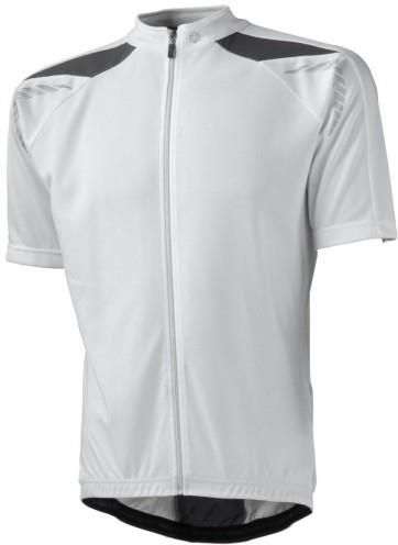 Koszulka męska rowerowa, wykonana z materiału technicznego COLON, który to materiał odprowadza wilgoć (pot) z ciała na zewnątrz. Koszulka posiada suwak na całej długości oraz ściągacz u dołu który się elastycznie dopasowuje do sylwetki. Na ramionach oraz wzdłuż talii są widoczne szwy. Na plecach są trzy kieszonki w tym jedna na suwak. Koszulka jest w kolorze białym.