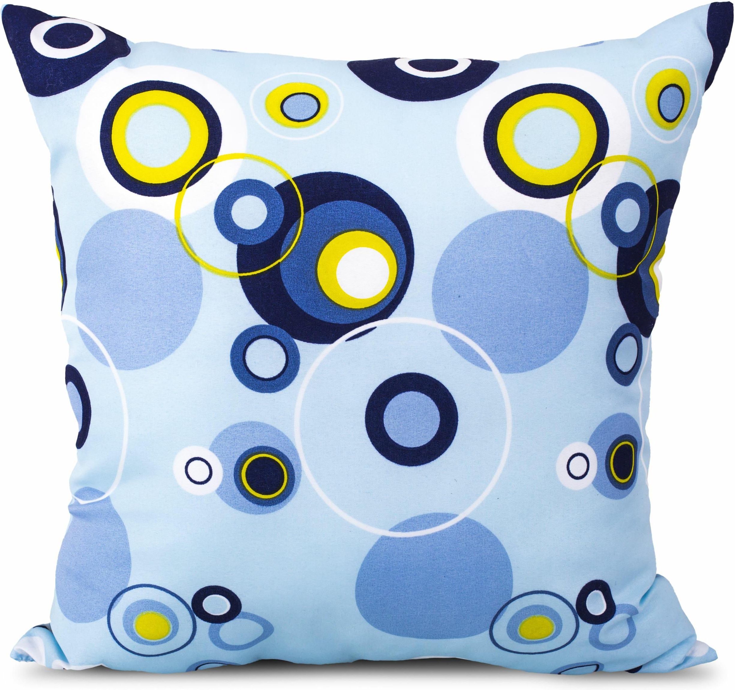 Poduszka Simply 40x40 błękitna w niebieskie i granatowe koła to miękka, estetyczna poduszka ozdobna idealna do nowoczesnych, młodzieżowych i minimalistycznych wnętrz. Jasne błękitne tło w połączeniu z okręgami w odcieniach niebieskiego, granatu, bieli i żółci tworzy energiczny, geometryczny wzór, …