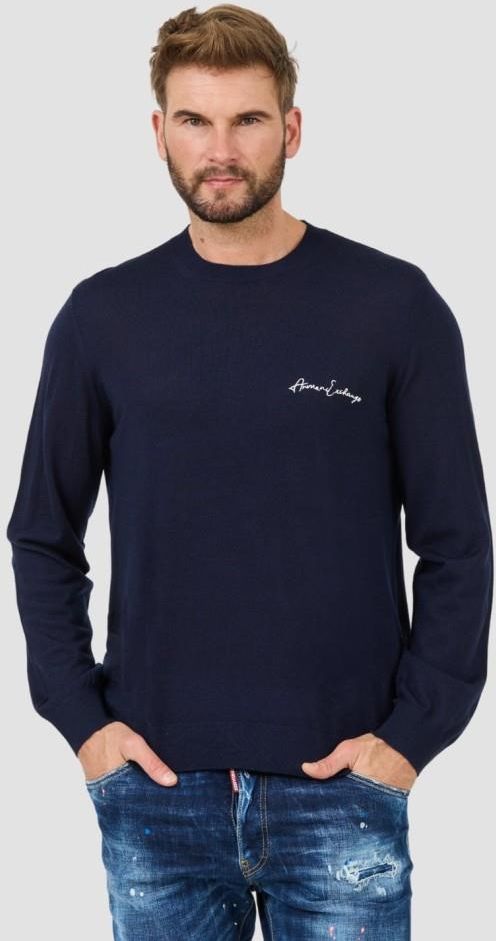 Granatowy męski sweter Jumpers, marki Armani Exchange.Wymiary modela: wzrost: 190 cm, klatka: 107 cm, pas: 93 cm.Model ma na sobie produkt w rozmiarze L.Wymiary produktu w rozmiarze L: szerokość pod pachami: 60 cm, długość całkowita: 69 cm.