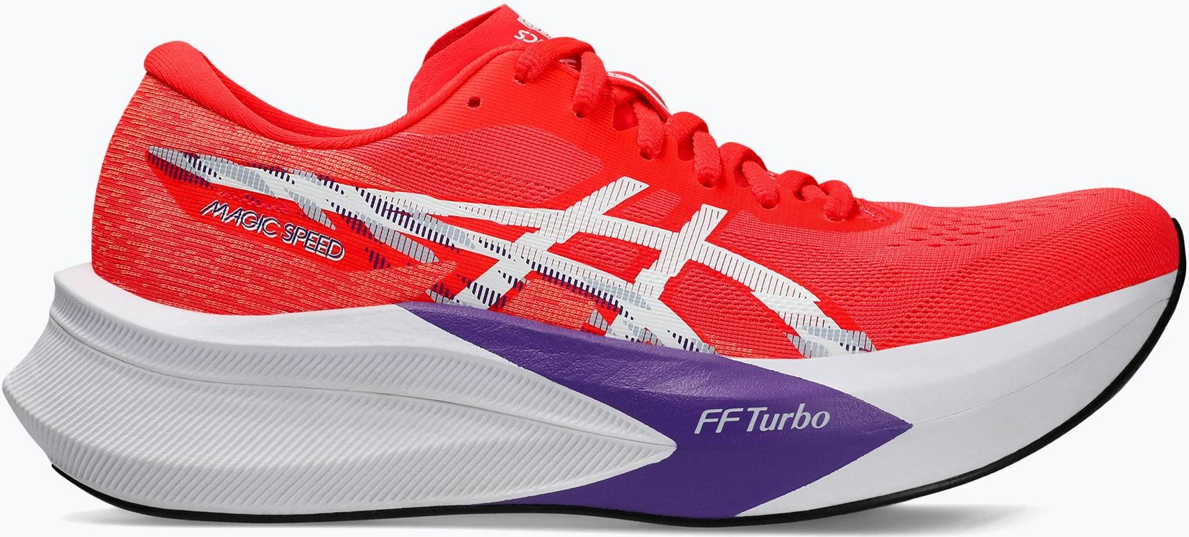 Buty do biegania męskie ASICS Magic Speed 4 flash red/white to doskonały wybór dla biegaczy poszukujących obuwia treningowego i startowego. Model ten charakteryzuje się neutralnym i stabilizującym profilem, co sprawia, że jest idealny dla biegaczy o neutralnej stopie. Cholewka z przewiewnej siateczki zapewnia doskonałą oddychalność, co zwiększa komfort użytkowania podczas intensywnych treningów. Lekka konstrukcja butów dodatkowo ułatwia pokonywanie długich dystansów. Technologia amortyzacji FF BLAST™ PLUS Buty do biegania męskie ASICS Magic Speed 4 flash red/white wyposażono w technologię FF BLAST™ PLUS, która zapewnia wyjątkową amortyzację i dynamikę biegu. Ta zaawansowana technologia pozwala na efektywne tłumienie wstrząsów, co przekłada się na mniejsze obciążenie stawów podczas biegu. Dzięki temu biegacz może cieszyć się płynnością ruchu oraz zwiększoną ochroną przed urazami. Przyczepność i stabilność z ASICSGRIP™ Model ten posiada podeszwę zewnętrzną wykonaną z materiału ASICSGRIP™, co gwarantuje doskonałą przyczepność na nawierzchniach asfaltowych. Ta specjalistyczna mieszanka gumy pozwala na pewniejsze pokonywanie zakrętów oraz stabilność na różnych typach nawierzchni. Dzięki temu buty ASICS Magic Speed 4 świetnie sprawdzają się zarówno podczas treningów, jak i startów w zawodach. Elementy odblaskowe i ekologiczny design Buty do biegania męskie ASICS Magic Speed 4 flash red/white posiadają elementy odblaskowe poprawiające widoczność biegacza w słabszych warunkach oświetleniowych. Dodatkowo ten model wykonano z recyklingowanych materiałów, co podkreśla zaangażowanie marki ASICS w ochronę środowiska. Dzięki temu użytkownicy mogą łączyć pasję do biegania z troską o planetę. Buty do biegania męskie ASICS Magic Speed 4 - cechy: Konstrukcja dostosowana do biegaczy o neutralnej stopie; Przewiewna siateczkowa cholewka zapewniająca oddychalność; Technologia amortyzacji FF BLAST™ PLUS dla zwiększonego komfortu biegu; Podeszwa zewnętrzna ASICSGRIP™ zapewniająca doskonałą przyczepność; Profil neutralny i stabilizujący dla lepszego wsparcia stopy; Standardowa szerokość cholewki zapewniająca dopasowanie; Elementy odblaskowe zwiększające widoczność biegacza; Wkładka OrthoLite® dla dodatkowej wygody; Recyklingowe materiały użyte do produkcji obuwia; Przeznaczone do biegania po nawierzchniach asfaltowych; Lekka konstrukcja ułatwiająca dynamiczny bieg; Rodzaj zapięcia na sznurówki dla pewnego trzymania stopy.