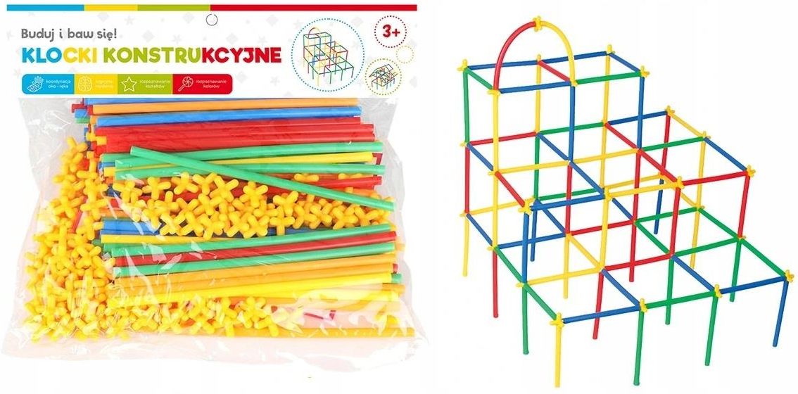 KLOCKI MAŁYCH GENIUSZY SŁOMKI KONSTRUKCYJNE 200 EL Klocki - patyczki - słomki, które za pomocą krzyżaków, można łączyć w różne figury. Zestaw składa się z 200 elementów. Patyk-słomka o wymiarach 19.5 x 0.5 cm w kolorze zielonym, niebieskim, pomarańczowym, żółtym oraz czerwonym. Bawiąc się słomkami, …