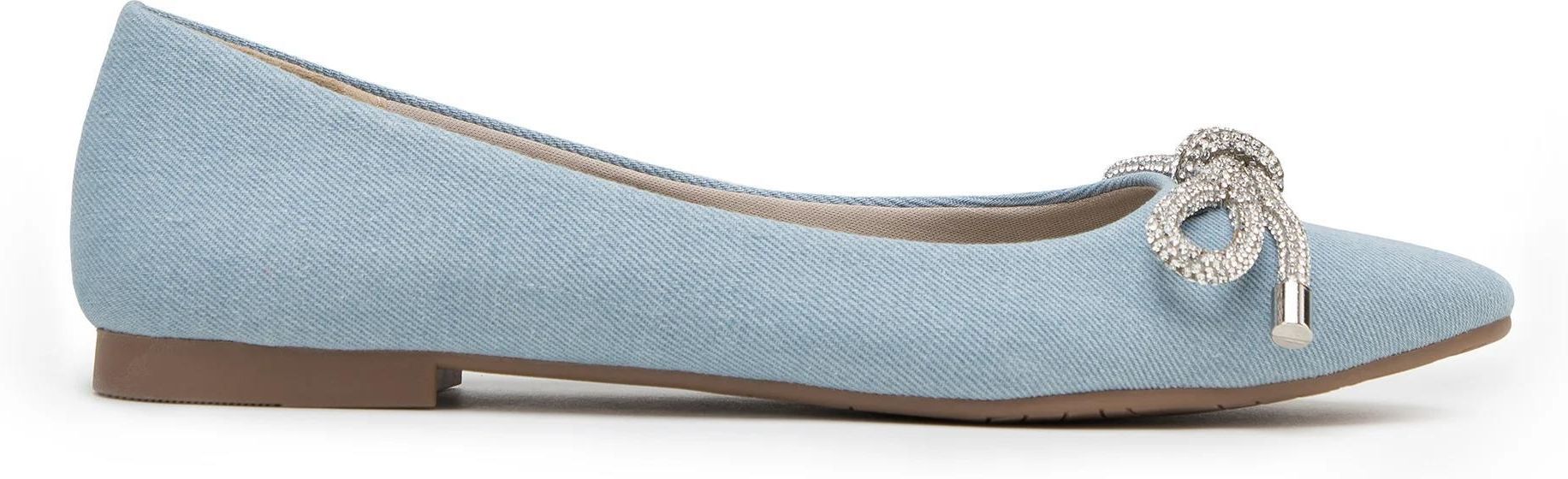 Damskie buty na płaskim obcasie. Dżinsowe balerinki to modny dodatek, który przyciągnie niejedno spojrzenie. Nosek w szpic zdobi błyszcząca kokarda z drobnych koralików. Buty mają miękką, wyprofilowaną wkładkę i płaski obcas, dzięki czemu wygodnie będzie w nich chodzić nawet przez cały dzień. Będą świetnym dopełnieniem i ulubionej minisukienki, i dżinsów i koszuli na co dzień. Baleriny dżinsowe z błyszczącą kokardą to klasyka w nowoczesnym wydaniu, która przyda Ci się na wiele okazji.Nasza rada: dobierz do nich błyszczące dodatki pod kolor kokardy. tworzywo sztuczne; wkładka i wyściółka z tworzywa sztucznego; podeszwa z tworzywa sztucznego; nosek w szpic; ozdobna błyszcząca kokarda. materiał syntetyczny materiał syntetyczny materiał syntetyczny