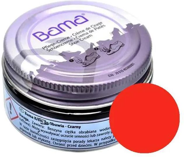 Koralowy krem, pasta do butów, Shoe Cream Bama, coral red 088, 50 ml, do skóry licowej, skóry gładkiej. Krem do obuwia w wygodnym opakowaniu z aplikatorem to doskonała propozycja dla każdego, kto chce nadać nowy wygląd swoim skórzanym butom. Krem doskonale chroni i pielęgnuje obuwie, ale dba też o jego wygląd. Krem nabłyszcza skórę. SPOSÓB UŻYCIA: z obuwia należy usunąć kurz i brud zalegający na powierzchni. Przed właściwym zastosowaniem środka należy przeprowadzić próbę na niewidocznym skrawku, sprawdzając działanie produktu. Za pomocą aplikatora z gąbeczką, który jest częścią opakowania, należy rozprowadzić równomiernie i dokładnie niewielką ilość kremu na powierzchni. Polerować do uzyskania pożądanego połysku. Paleta dostępnych kolorów Shoe Cream Bama, 50 ml